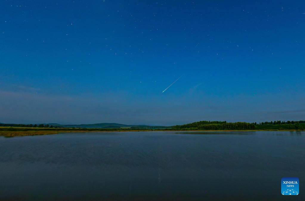 This photo taken on Aug. 11, 2025 shows Perseid meteor shower over a wetland in Harbin City, northeast China's Heilongjiang Province. The annual Perseid meteor shower peaked on Wednesday. (Photo by Liu Dapeng/Xinhua)