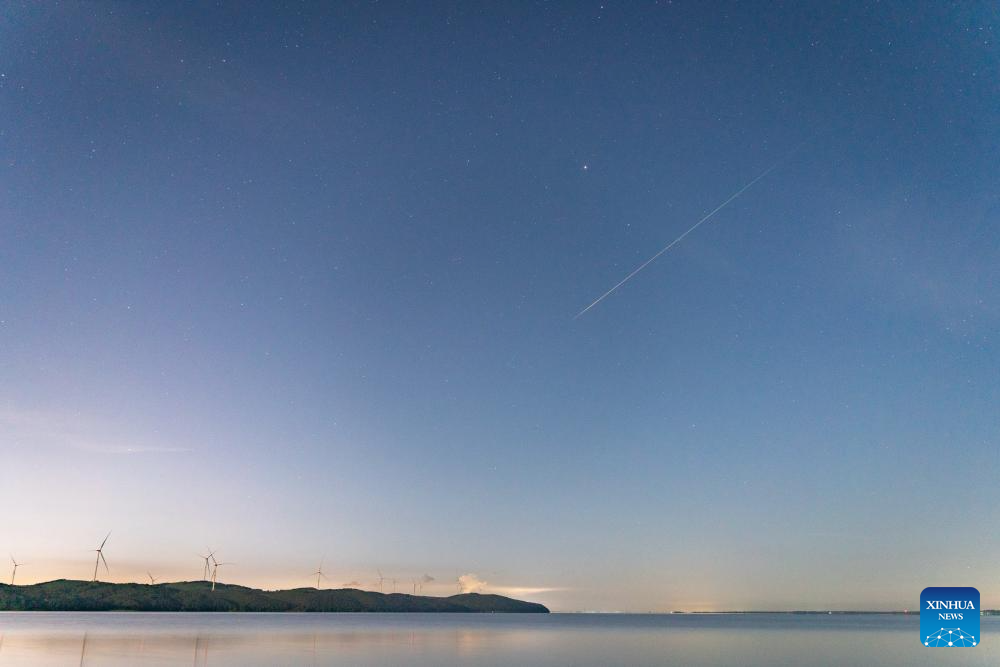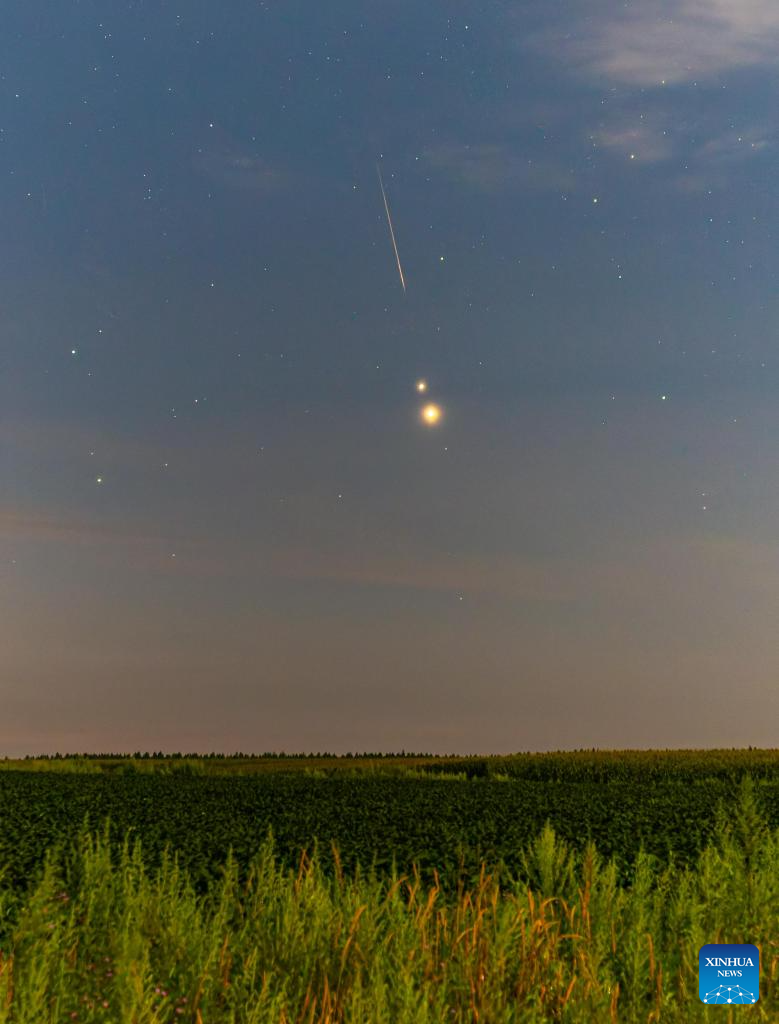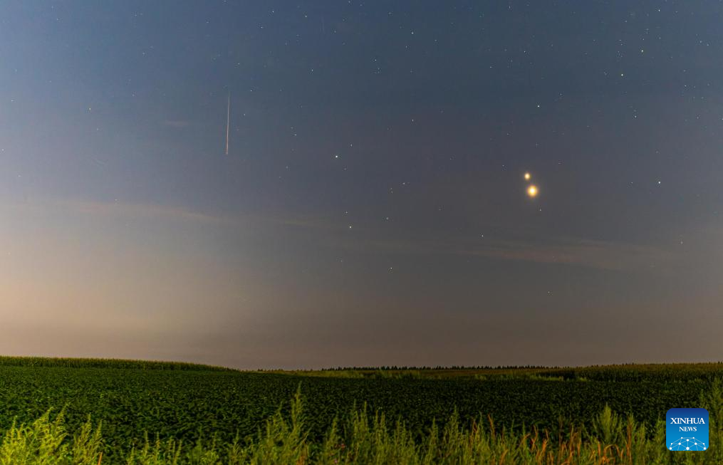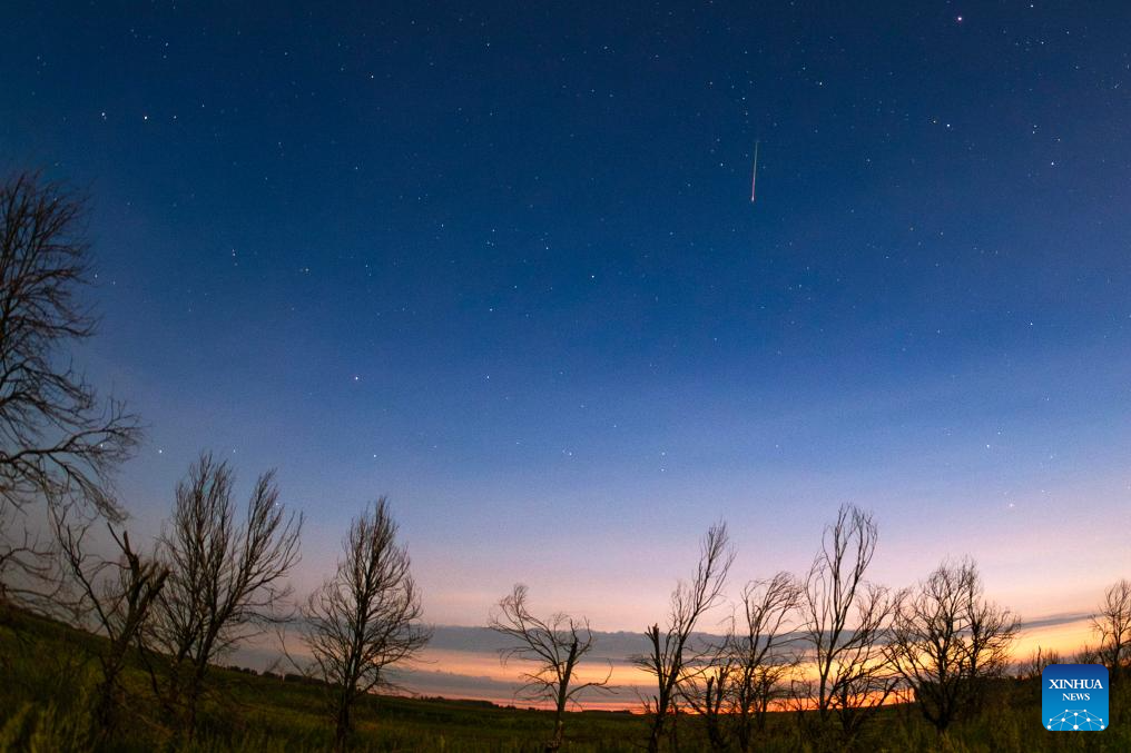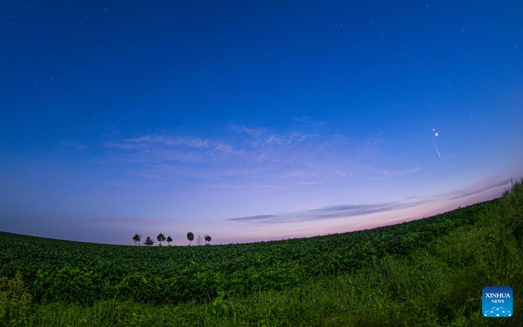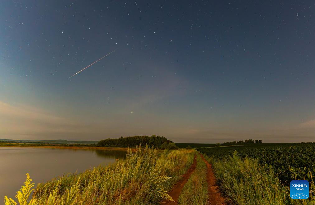 This photo taken on Aug. 12, 2025 shows Perseid meteor shower over Tangyuan County of Jiamusi City, northeast China's Heilongjiang Province. The annual Perseid meteor shower peaked on Wednesday. (Photo by Zhu Zongqiang/Xinhua)