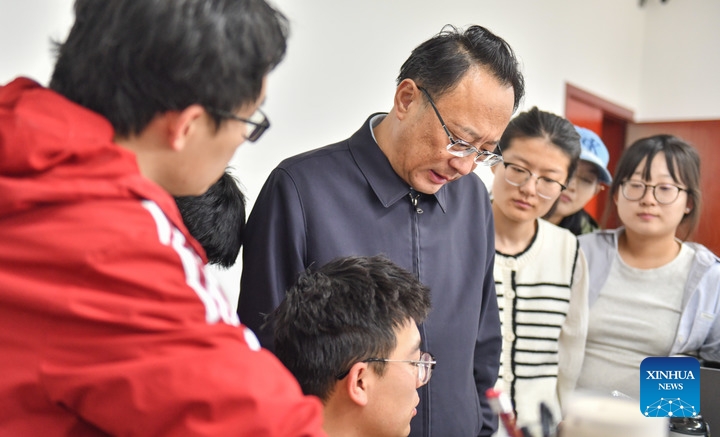 Nyima Tashi (C) discusses the operation of a Tibetan-Mandarin real-time translation applet with his students at Xizang University in Lhasa, southwest China's Xizang Autonomous Region, May 30, 2024. (Xinhua/Jigme Dorje)