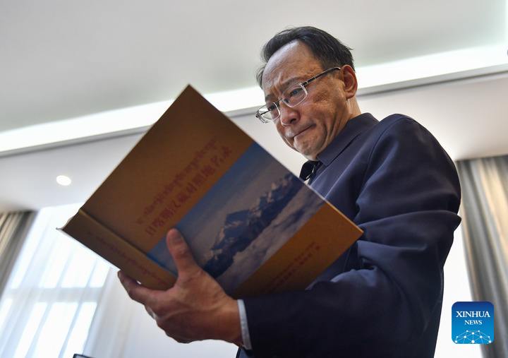 Nyima Tashi reads a Tibetan reference book at Xizang University in Lhasa, southwest China's Xizang Autonomous Region, May 30, 2024. (Xinhua/Jigme Dorje)
