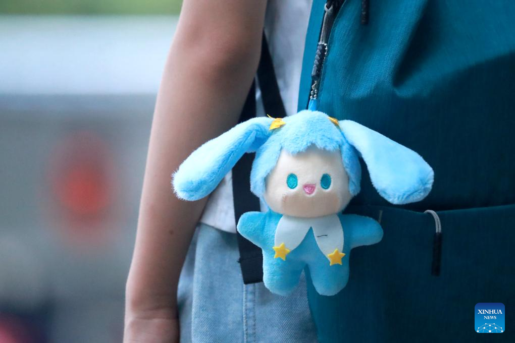 A young girl presents bag charms during an anime and comic exhibition in Dongguan, south China's Guangdong Province, Aug. 11, 2025. Bag charms have gained increasingly popularity in China recently, which allow young people to express themselves while fueling an emgering business.