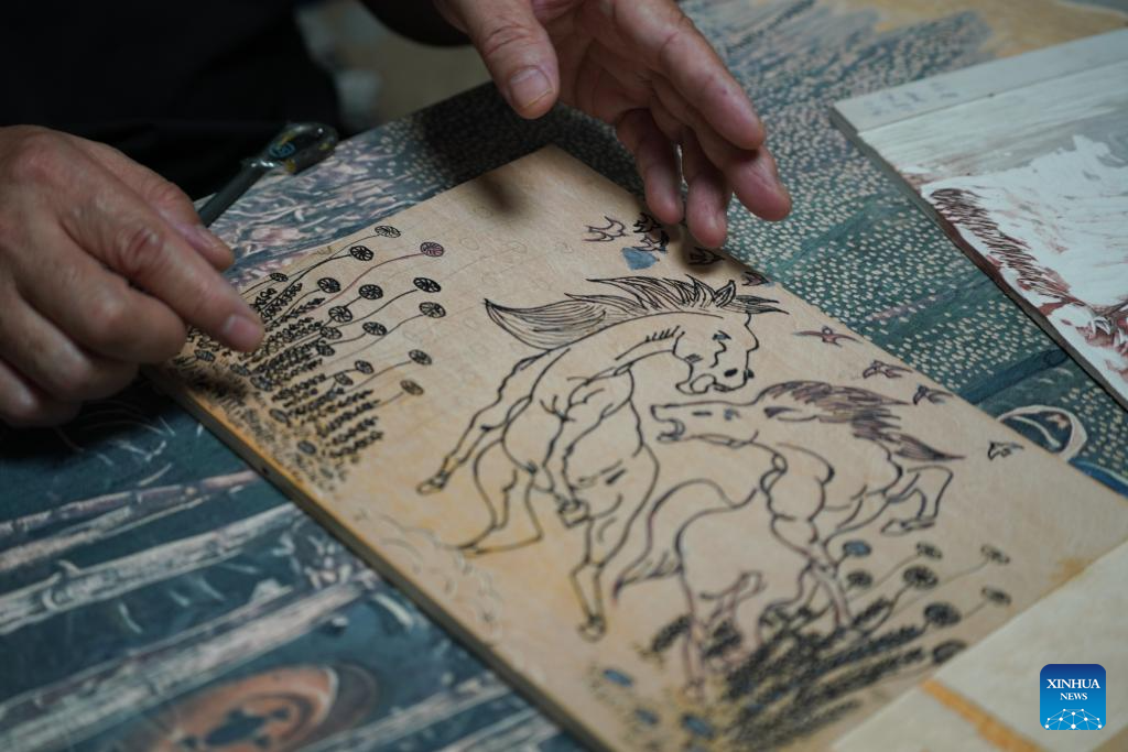 Nowadays, woodblock painting artists in Jarud, professional and amateur alike, are turning out vast amount of artworks that reflect their modern life on the grasslands. (Xinhua/Lian Zhen)
