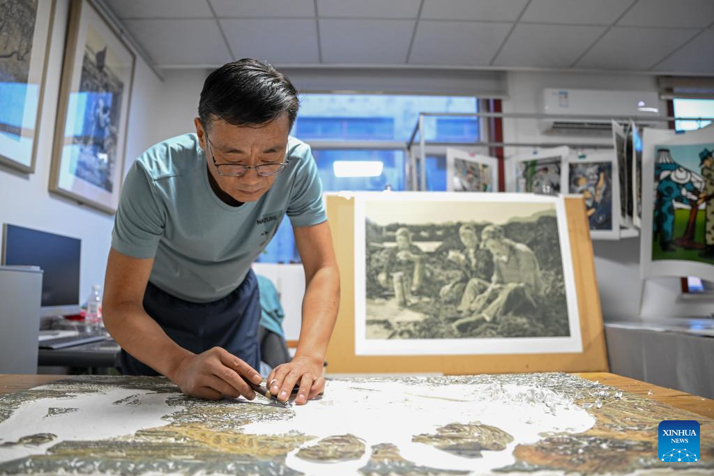 Painter Qi Tongyue introduces his artworks at a woodblock painting institute in Jarud Banner, north China's Inner Mongolia Autonomous Region, Aug. 10, 2025. (Xinhua/Liu Wenhui)