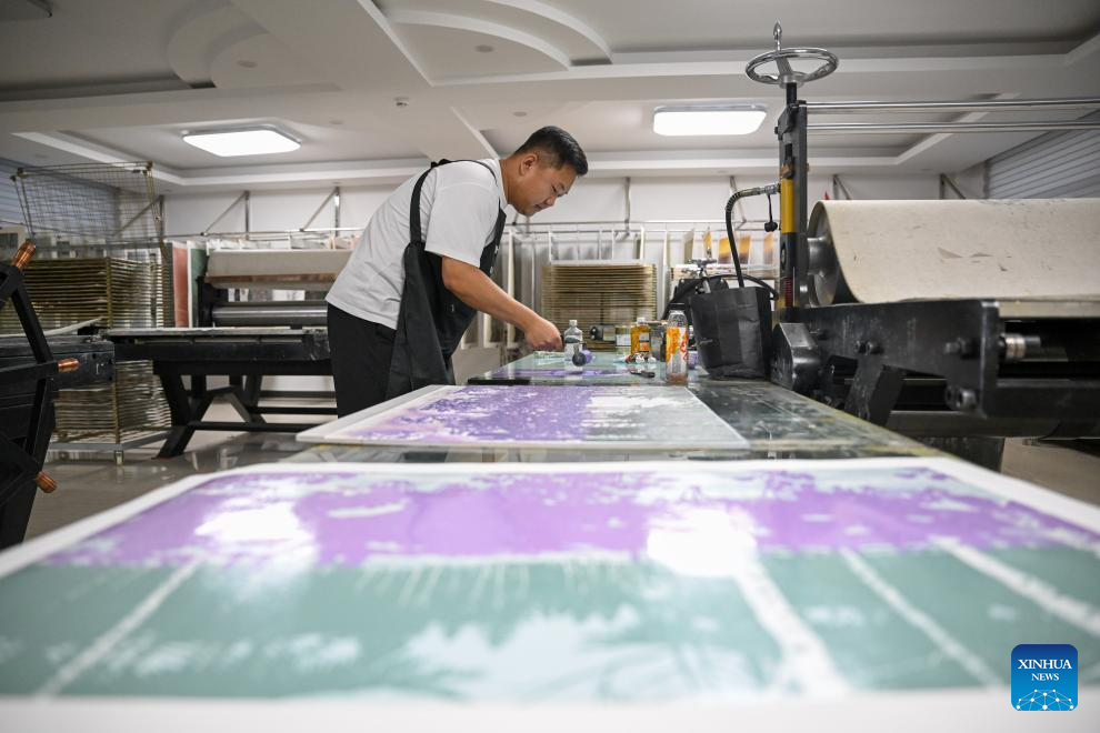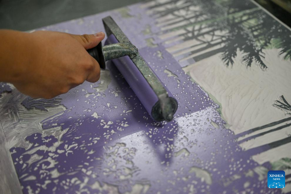 Painter Qi Tongyue creates a Jarud woodblock painting at a woodblock painting institute in Jarud Banner, north China's Inner Mongolia Autonomous Region, Aug. 10, 2025. (Xinhua/Liu Wenhui)