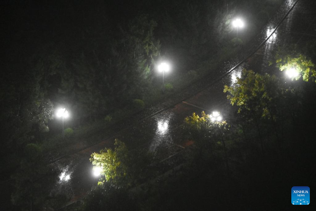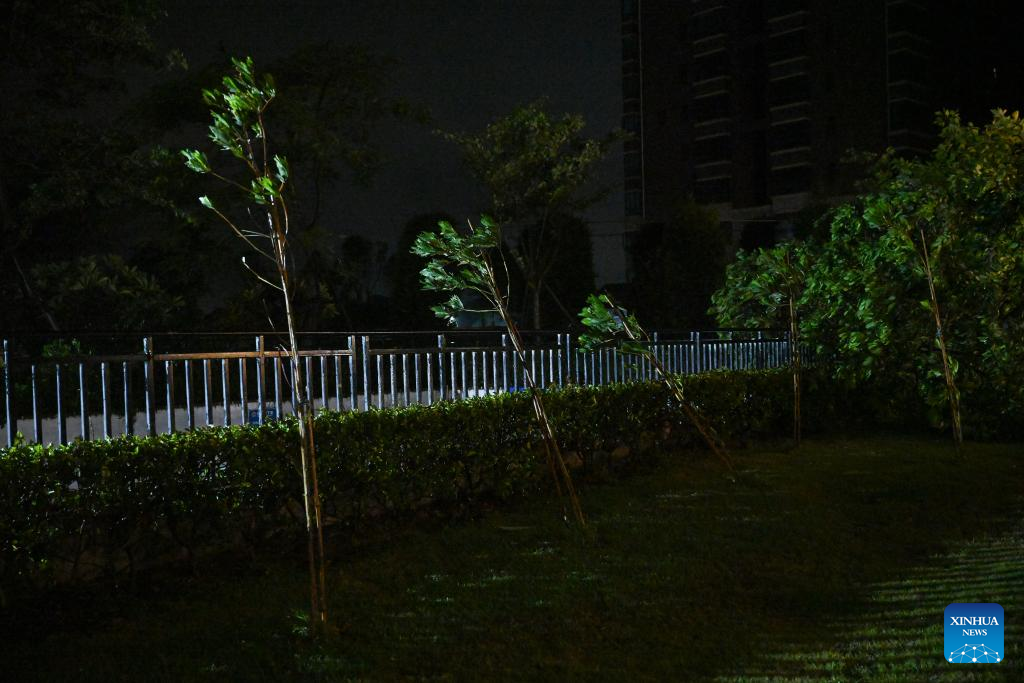 Trees sway in strong wind and heavy rainfall in the coastal area of Zhangpu County in Zhangzhou City, southeast China's Fujian Province, early Aug. 14, 2025.