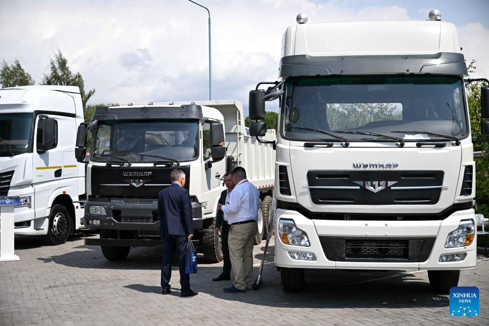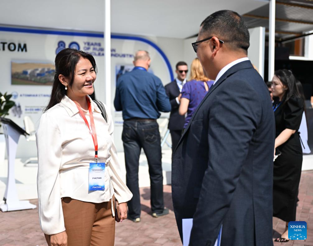 People visit the exhibition area of the 7th Kyrgyz-Russian Economic Forum in the eastern resort town of Cholpon-Ata, Kyrgyzstan, on Aug. 14, 2025. The forum being held here on Thursday has gathered over 1,000 people, including government officials and business leaders, who are expected to discuss a range of issues such as digital sovereignty and technological cooperation. The event, themed "Digital Sovereignty as a Driver of Economic Growth," runs from Aug. 13-15 at the lakeside town in Kyrgyzstan's Issyk-Kul region. (Xinhua/Li Renzi)