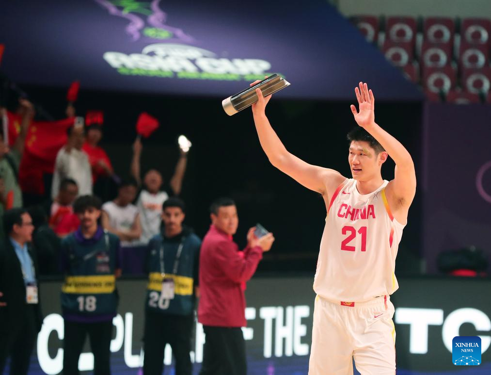 Hu Jinqiu of China waves to the spectators after the quarterfinal match between China and South Korea at the FIBA Asia Cup 2025 in Jeddah, Saudi Arabia, Aug. 14, 2025. (Xinhua/Wang Dongzhen)