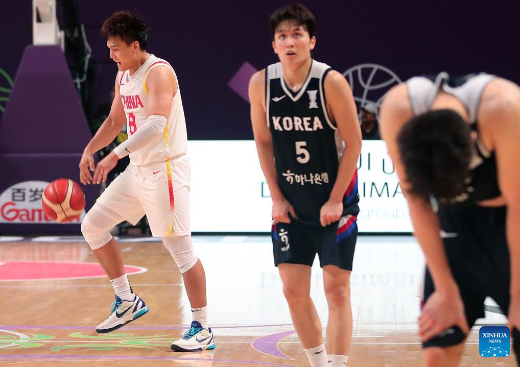 Zhao Rui (L) of China and Yang Junseok (C) of South Korea react after the quarterfinal match between China and South Korea at the FIBA Asia Cup 2025 in Jeddah, Saudi Arabia, Aug. 14, 2025. (Xinhua/Wang Dongzhen)