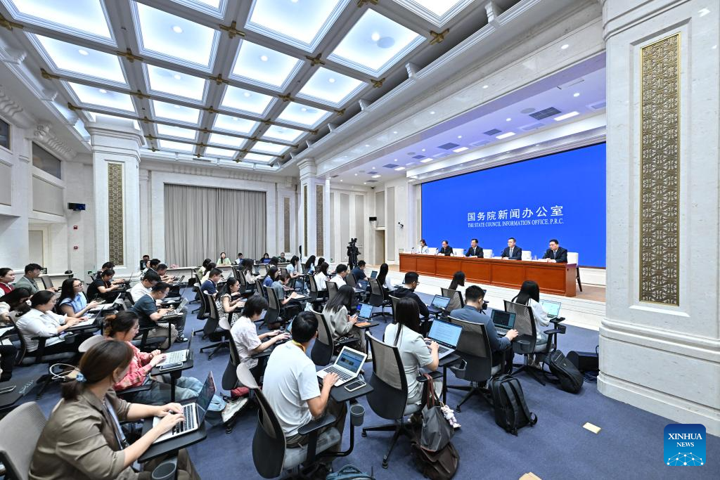 Liu Liehong, a member of the Communist Party of China Leadership Group of the National Development and Reform Commission and head of the National Data Administration (NDA), NDA deputy heads Shen Zhulin, Chen Ronghui and Xia Bing attend a press conference held by the State Council Information Office (SCIO) on achievements in Digital China development during the 14th Five-Year Plan period (2021-2025) in Beijing, capital of China, Aug. 14, 2025. (Xinhua/Li Xin)