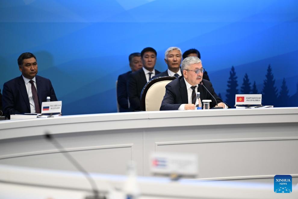 Chairman of the cabinet of ministers of Kyrgyzstan Adylbek Kasymaliev (C) speaks during an expanded session of the Eurasian Intergovernmental Council in Cholpon-Ata, Kyrgyzstan, on Aug. 15, 2025. The Eurasian Economic Union (EAEU) has grown into a major center of economic activity over the past decade, Kyrgyzstan's top government official said Friday. (Xinhua/Li Renzi)