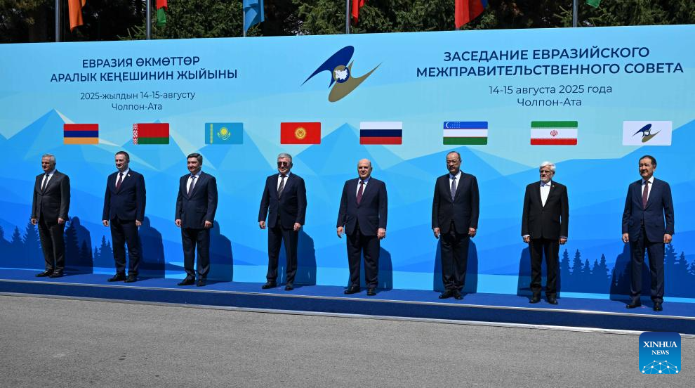 Representatives pose for a group photo before an expanded session of the Eurasian Intergovernmental Council in Cholpon-Ata, Kyrgyzstan, on Aug. 15, 2025. The Eurasian Economic Union (EAEU) has grown into a major center of economic activity over the past decade, Kyrgyzstan's top government official said Friday. (Xinhua/Li Renzi)