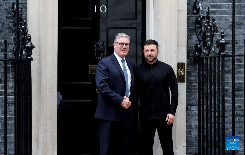 British Prime Minister Keir Starmer (L) welcomes Ukrainian President Volodymyr Zelensky at 10 Downing Street in London, Britain, on Aug. 14, 2025. (Xinhua/Li Ying)