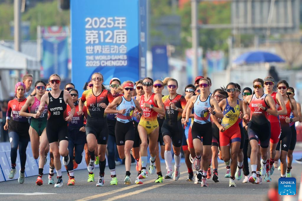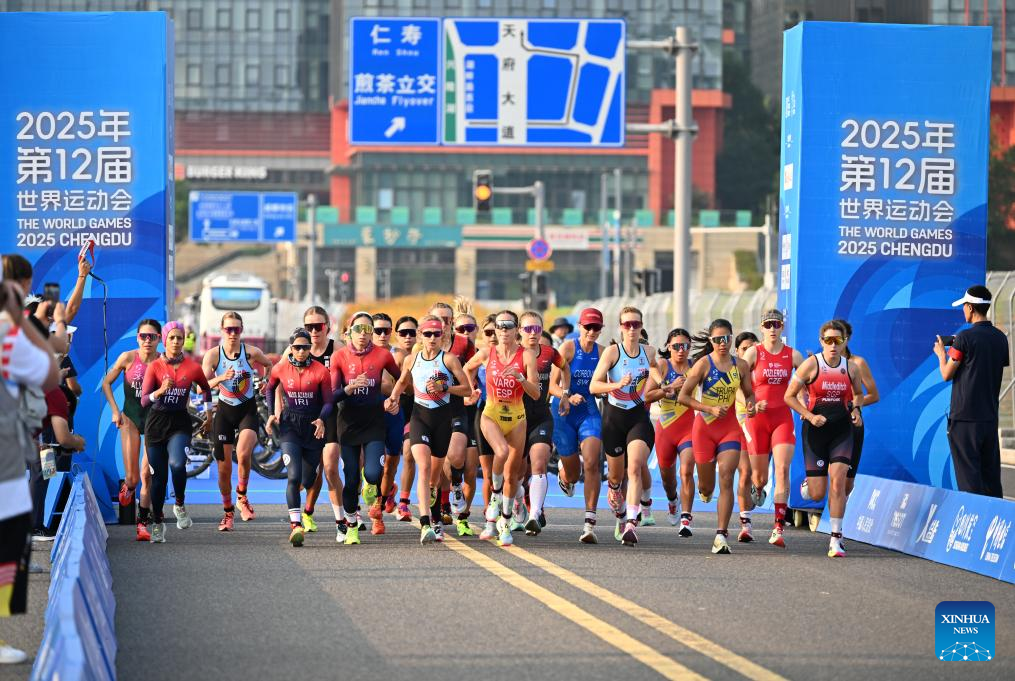 Athletes start during the Duathlon Women's Individual Final at The World Games 2025 in Chengdu, southwest China's Sichuan Province, Aug. 15, 2025. (Xinhua/Li Jianan)