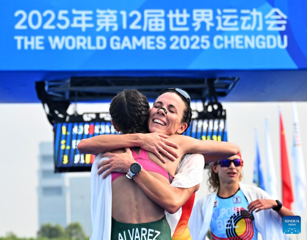 Anahi Alvarez Corral (L) of Mexico and Maria Varo Zubiri of Spain hug each other after crossing the finish line during the Duathlon Women's Individual Final at The World Games 2025 in Chengdu, southwest China's Sichuan Province, Aug. 15, 2025. (Xinhua/Li Jianan)