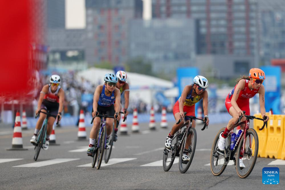 Anahi Alvarez Corral (C) of Mexico crosses the finish line during the Duathlon Women's Individual Final at The World Games 2025 in Chengdu, southwest China's Sichuan Province, Aug. 15, 2025. (Xinhua/Li Jianan)