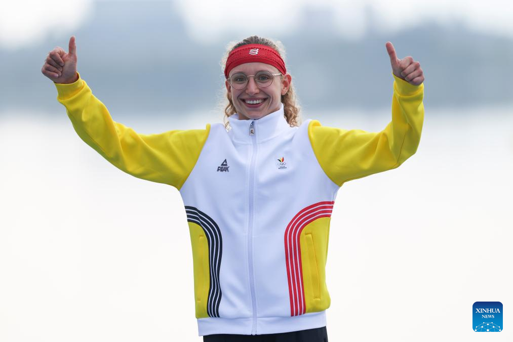 Bronze medalist Jeanne Dupont of Belglium celebrates during the victory ceremony for the Duathlon Women's Individual at The World Games 2025 in Chengdu, southwest China's Sichuan Province, Aug. 15, 2025. (Xinhua/Wang Xiang)