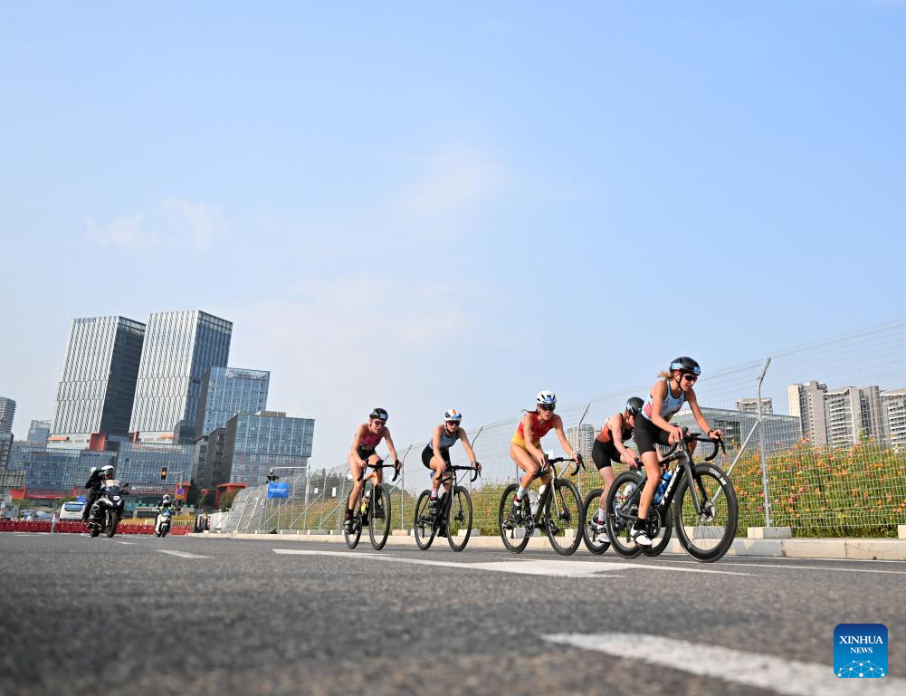 Athletes ride during the Duathlon Women's Individual Final at The World Games 2025 in Chengdu, southwest China's Sichuan Province, Aug. 15, 2025. (Xinhua/Li Jianan)