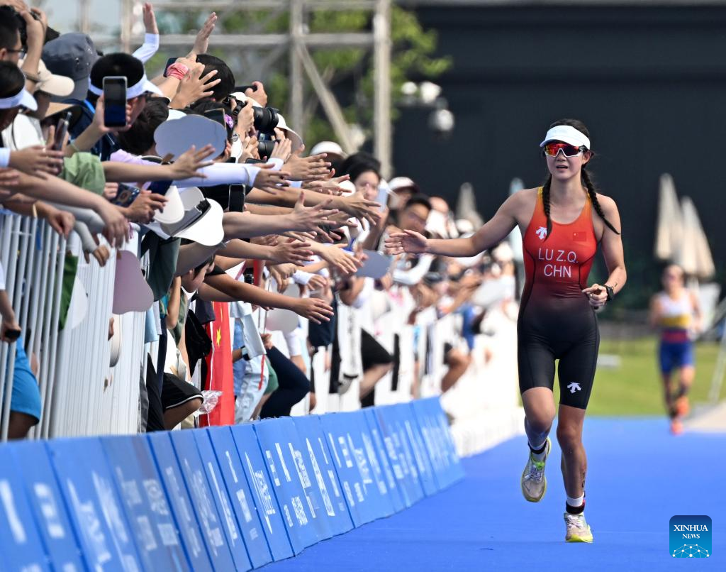 Lu Ziqing of China claps hands with spectators before crossing the finish line during the Duathlon Women's Individual Final at The World Games 2025 in Chengdu, southwest China's Sichuan Province, Aug. 15, 2025. (Xinhua/Li Jianan)