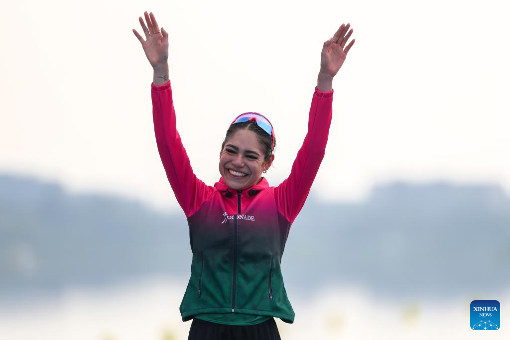 Gold medalist Anahi Alvarez Corral of Mexico celebrates during the victory ceremony for the Duathlon Women's Individual at The World Games 2025 in Chengdu, southwest China's Sichuan Province, Aug. 15, 2025. (Xinhua/Wang Xiang)
