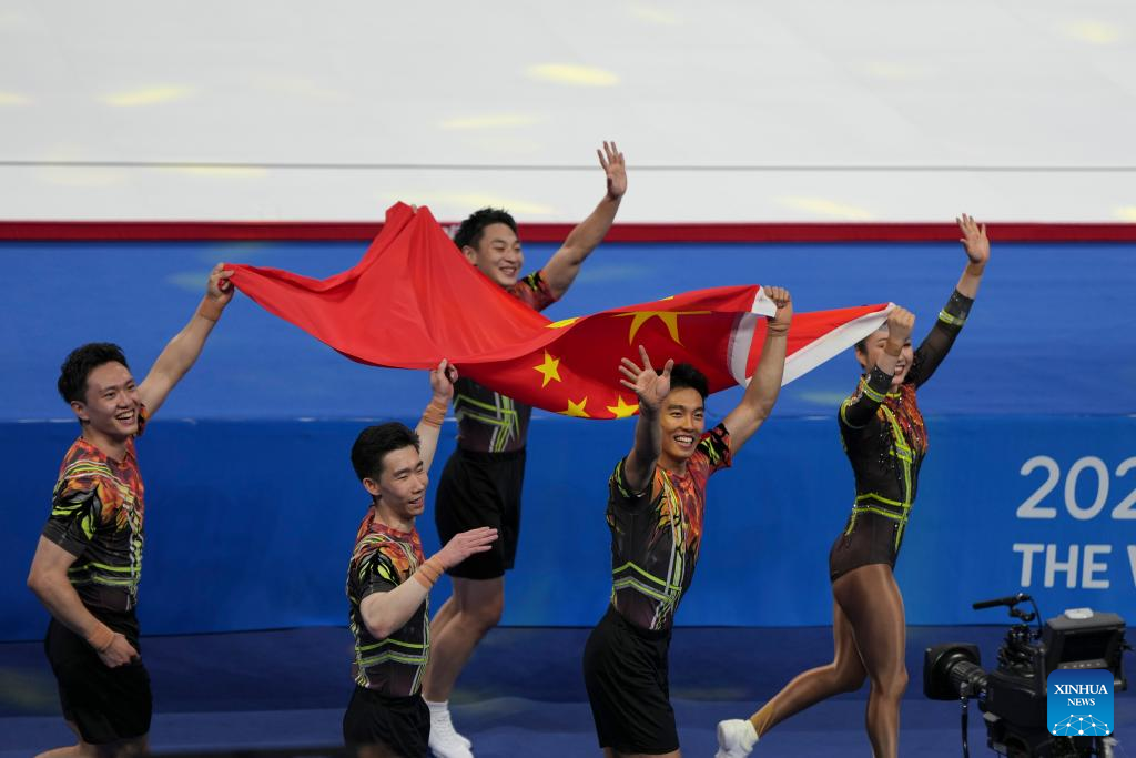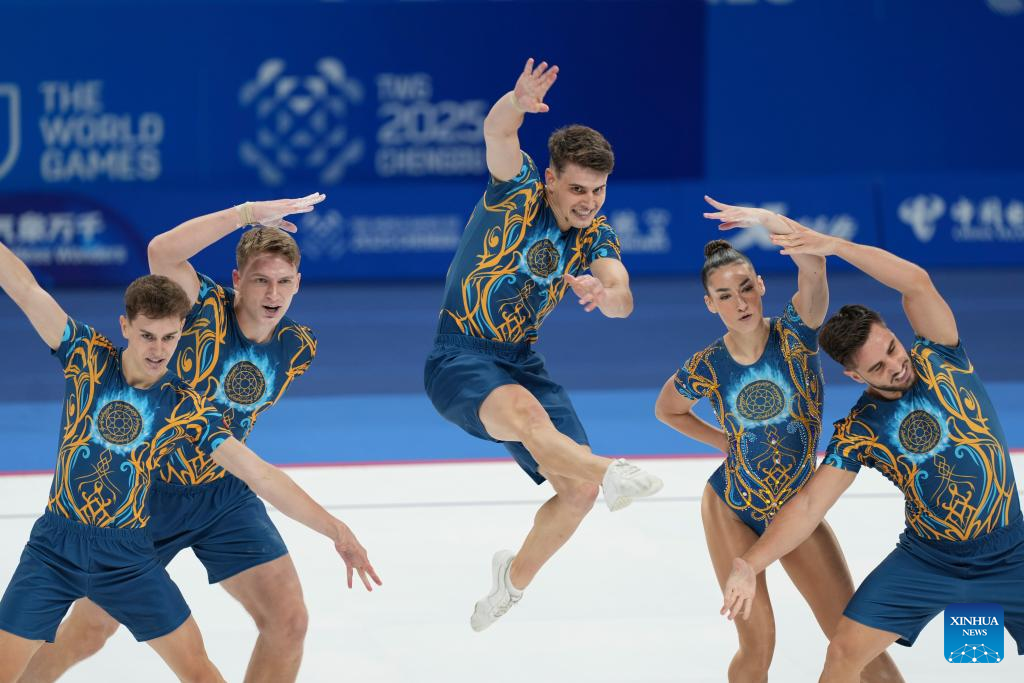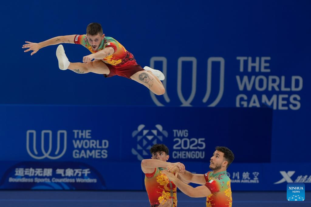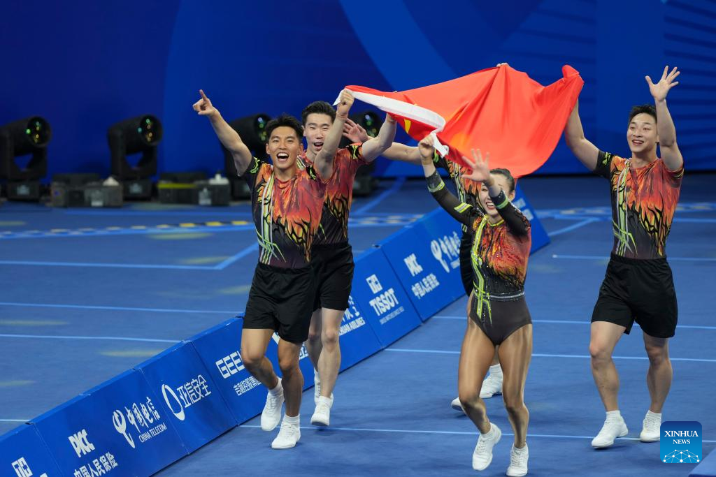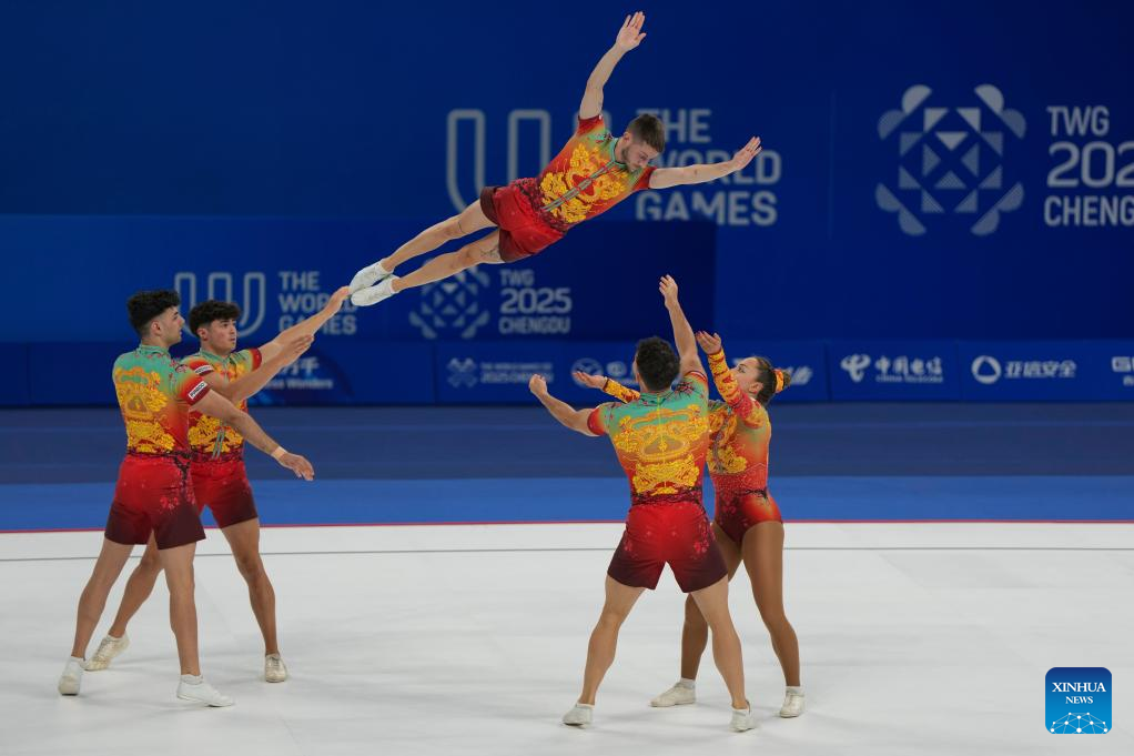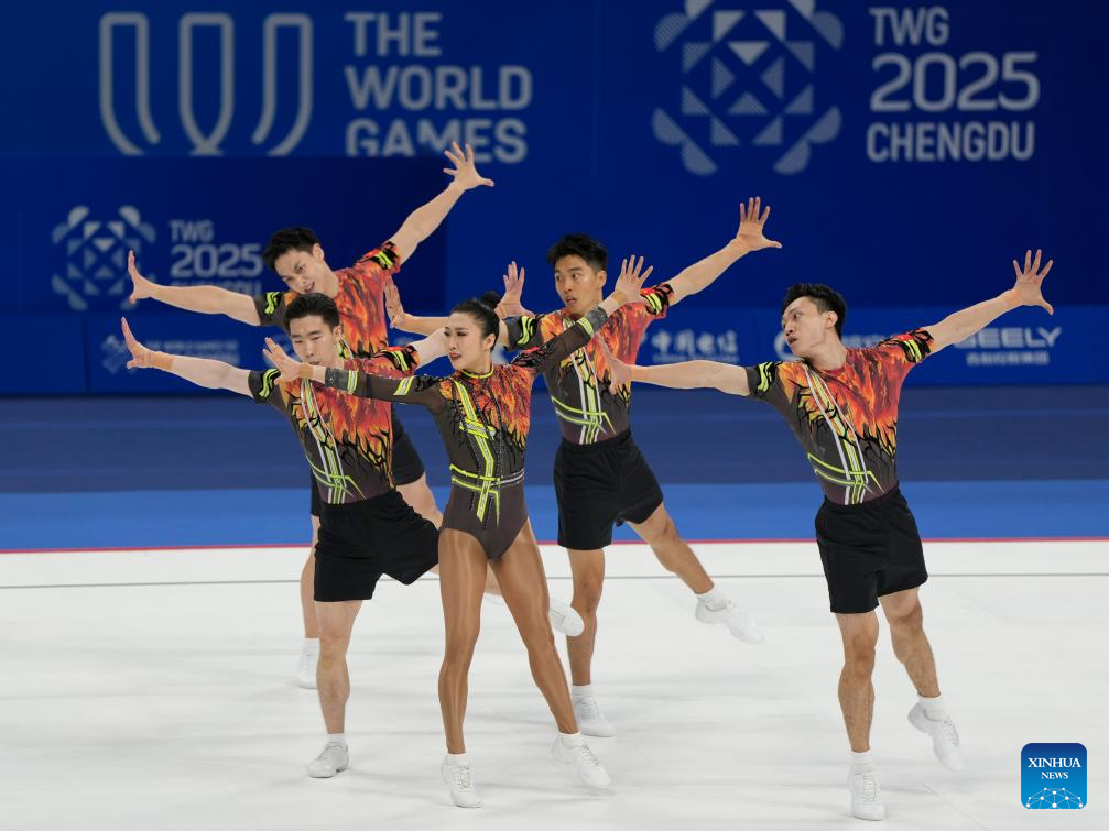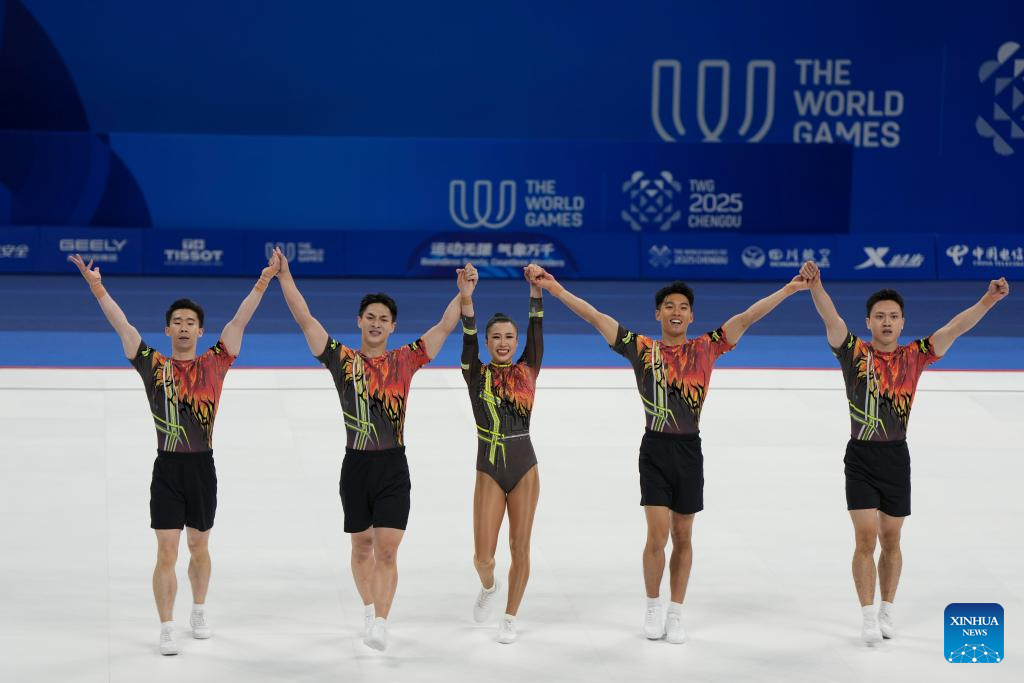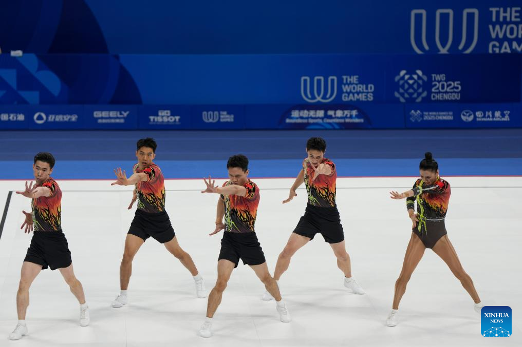 CHENGDU, Aug. 15 (Xinhua) -- China claimed the aerobic gymnastics group gold at the Chengdu World Games here on Friday, with Italy taking silver and Romania bronze at the Dong'an Lake Sports Park Multi-Function Gymnasium.