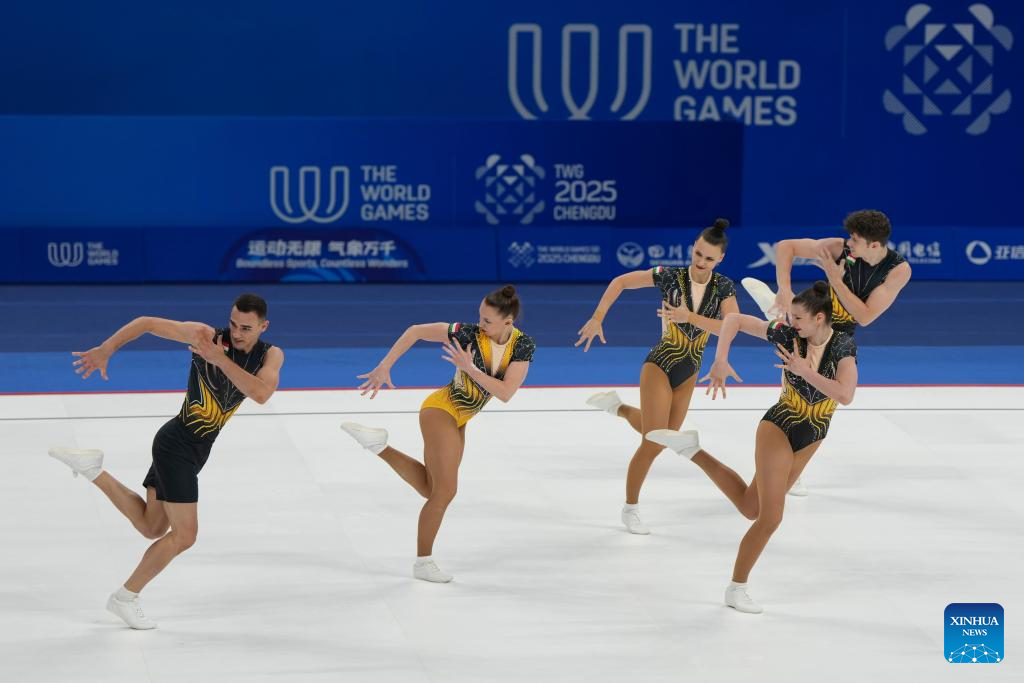 Team Italy perform during the Aerobic Gymnastics Group Final at The World Games 2025 in Chengdu, southwest China's Sichuan Province, Aug. 15, 2025. (Xinhua/Xu Bingjie)