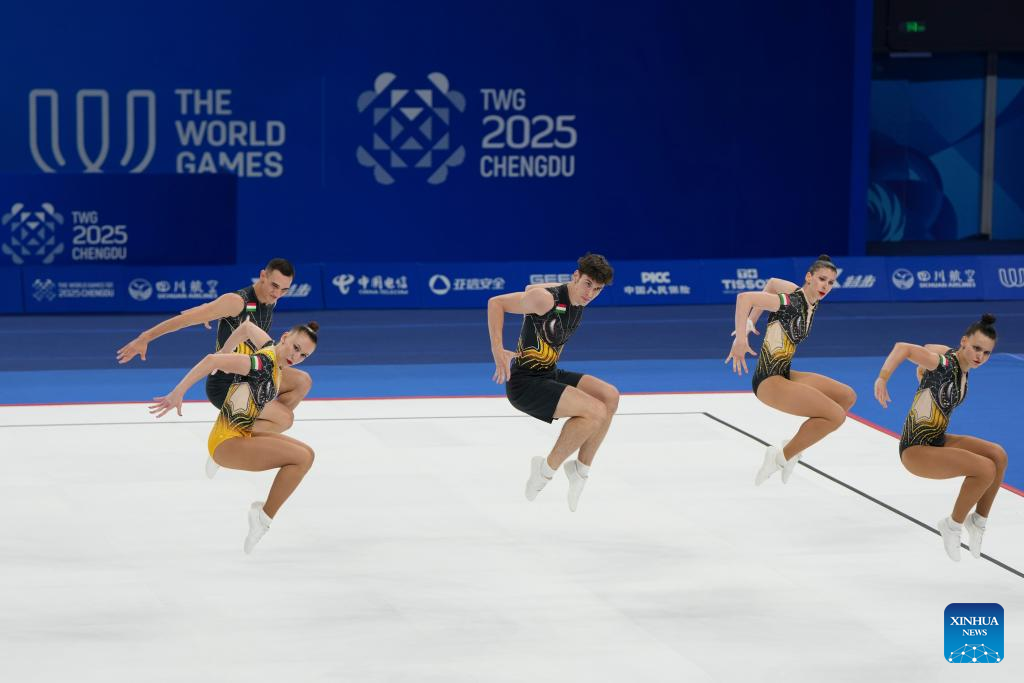 Team Hungary perform during the Aerobic Gymnastics Group Final at The World Games 2025 in Chengdu, southwest China's Sichuan Province, Aug. 15, 2025. (Xinhua/Xu Bingjie)