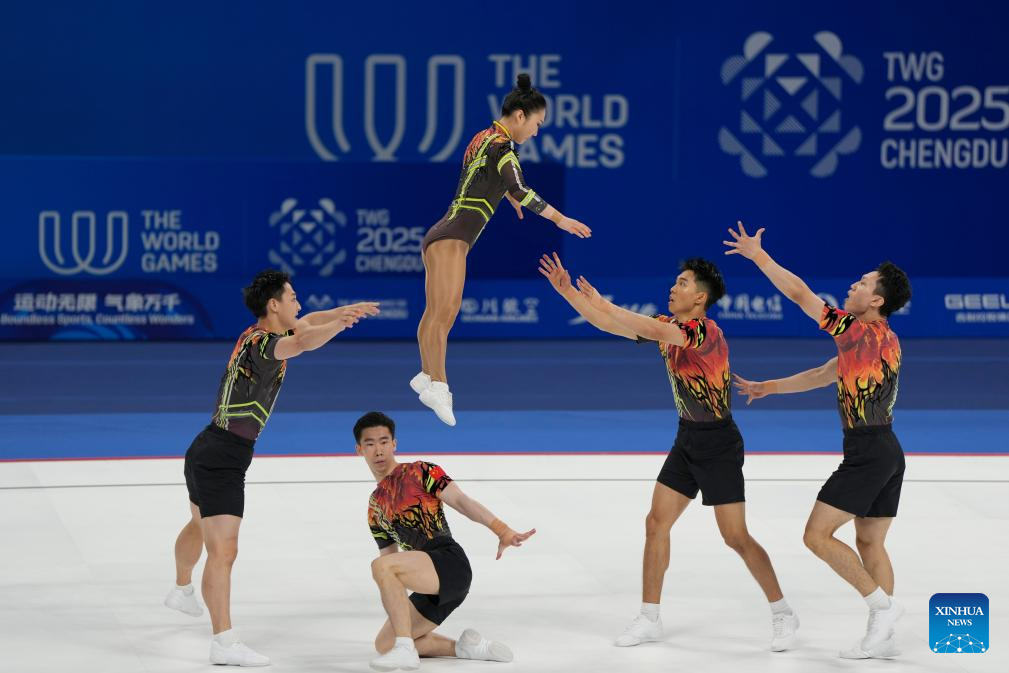 Team China perform during the Aerobic Gymnastics Group Final at The World Games 2025 in Chengdu, southwest China's Sichuan Province, Aug. 15, 2025. (Xinhua/Xu Bingjie)