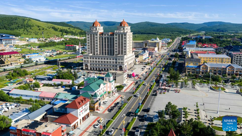 An aerial drone photo taken on July 27, 2025 shows the main street in Arxan, north China's Inner Mongolia Autonomous Region. Arxan, a city with less than 40,000 residents and a vegetation coverage of over 95 percent, sits at the southwestern foot of the Dahinggan Mountains, also the intersection of four major grasslands in northern China. It is now an increasingly popular tourist destination. (Xinhua/Ma Jinrui)