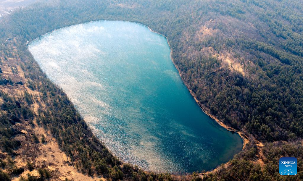 An aerial drone photo taken on May 20, 2025 shows the Tuofengling Tianchi (Heavenly Lake) at the Arxan national forest park in Arxan, north China's Inner Mongolia Autonomous Region. Arxan, a city with less than 40,000 residents and a vegetation coverage of over 95 percent, sits at the southwestern foot of the Dahinggan Mountains, also the intersection of four major grasslands in northern China. It is now an increasingly popular tourist destination. (Xinhua/Ma Jinrui)
