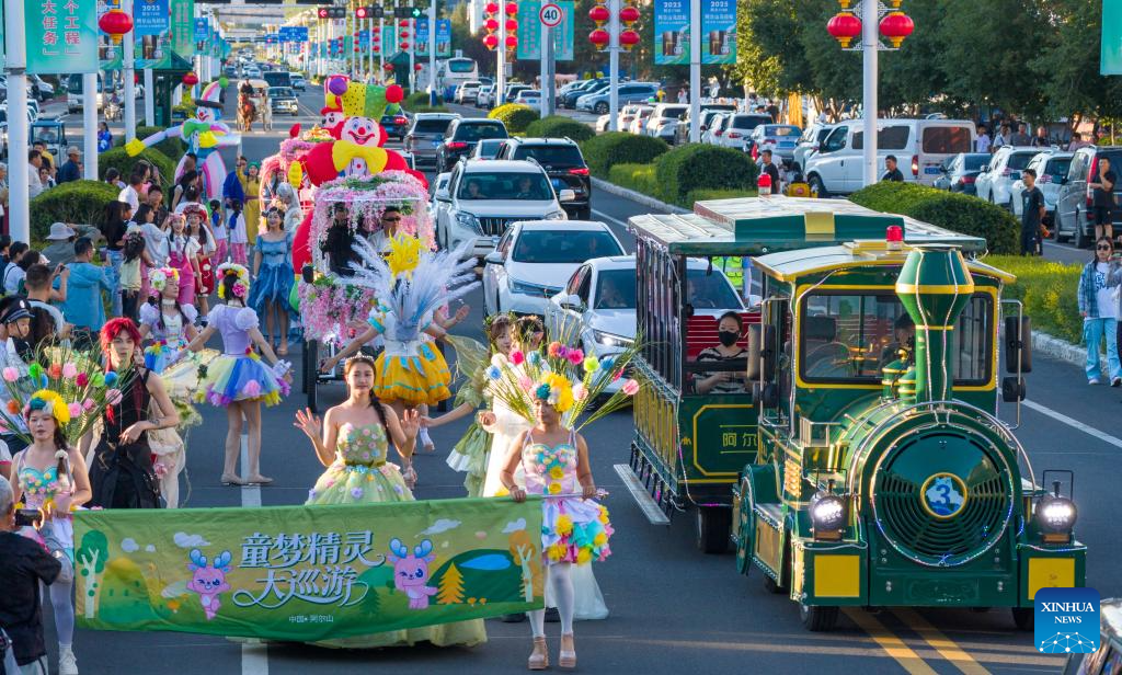 A drone photo taken on July 27, 2025 shows a float parade on a street with a sightseeing vehicle in Arxan, north China's Inner Mongolia Autonomous Region. Arxan, a city with less than 40,000 residents and a vegetation coverage of over 95 percent, sits at the southwestern foot of the Dahinggan Mountains, also the intersection of four major grasslands in northern China. It is now an increasingly popular tourist destination. (Xinhua/Ma Jinrui)