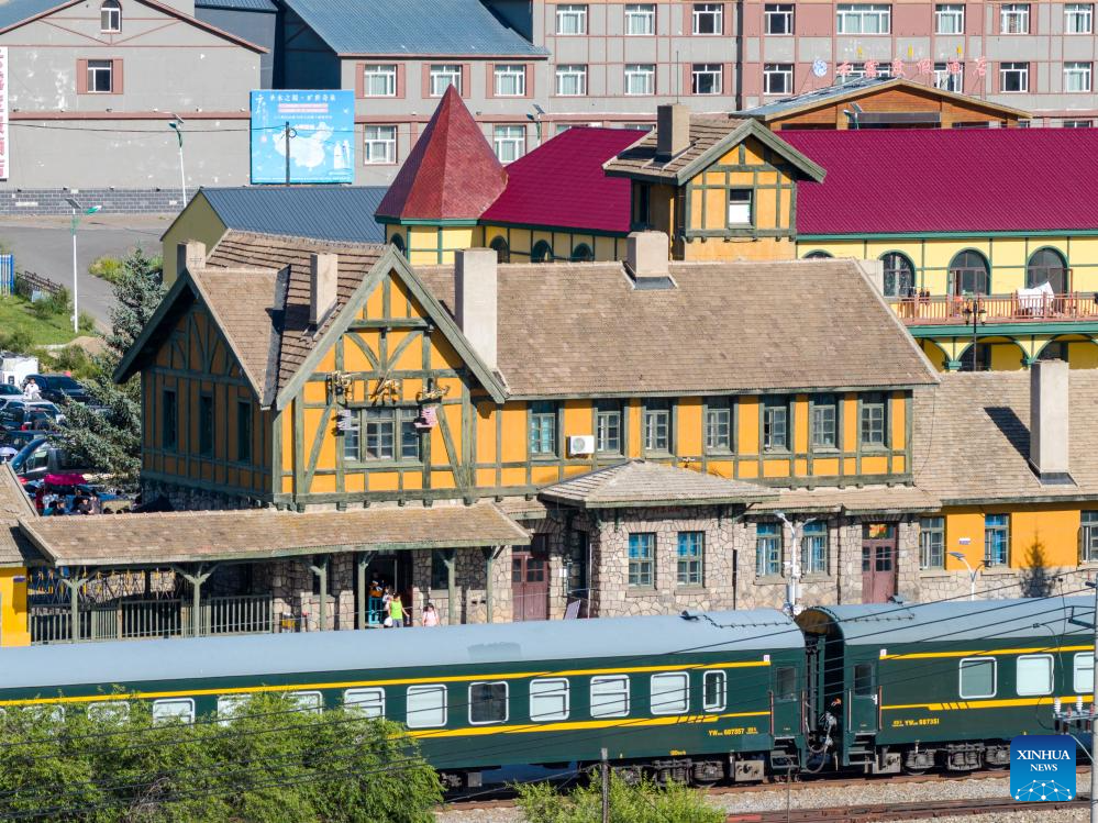 A drone photo taken on July 27, 2025 shows a train leaving the railway station of Arxan, north China's Inner Mongolia Autonomous Region. Arxan, a city with less than 40,000 residents and a vegetation coverage of over 95 percent, sits at the southwestern foot of the Dahinggan Mountains, also the intersection of four major grasslands in northern China. It is now an increasingly popular tourist destination. (Xinhua/Ma Jinrui)