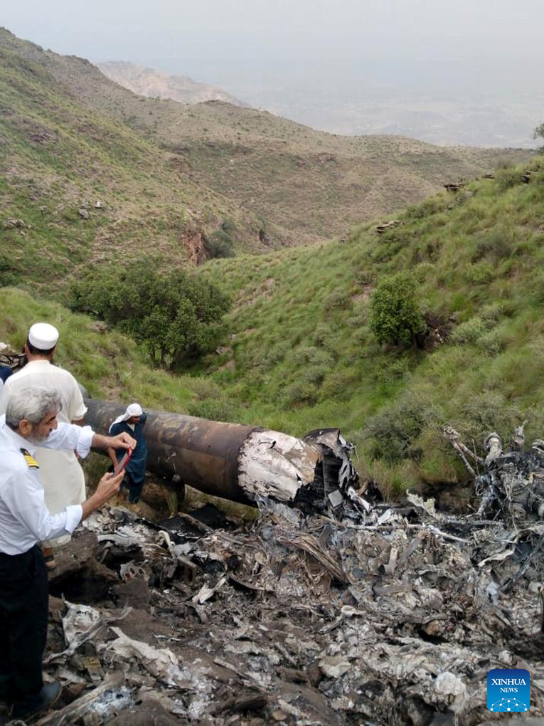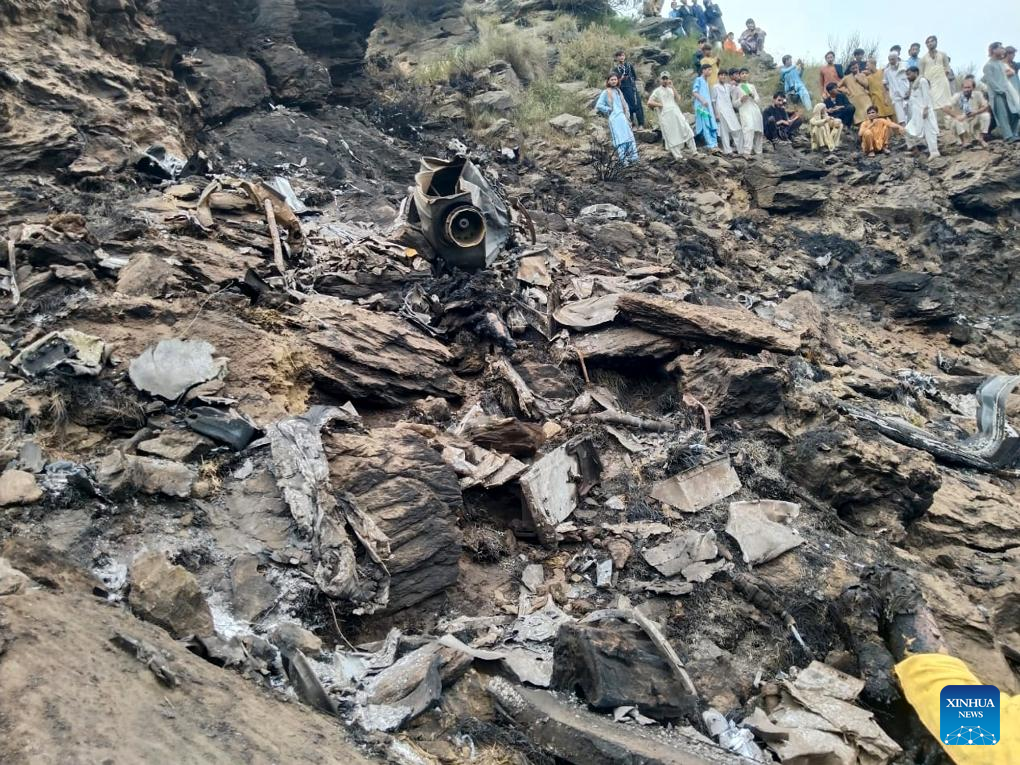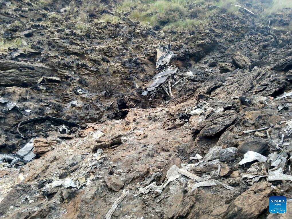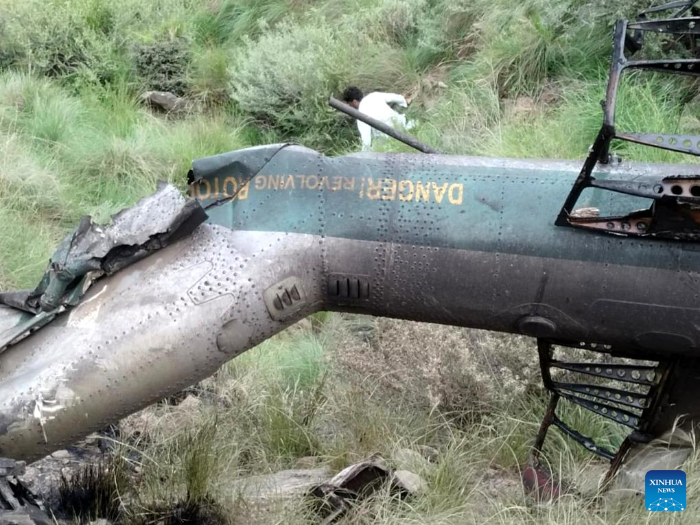 This photo taken with mobile phone shows debris of a crashed helicopter in Bajaur district of Khyber Pakhtunkhwa province, Pakistan, on Aug. 15, 2025. A rescue helicopter carrying relief goods to flood-affected areas crashed in the country's northwest province on Friday, killing all five people on board, including two pilots, officials said. (Str/Xinhua)