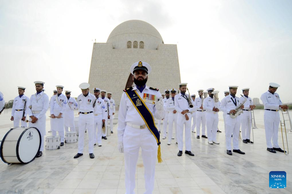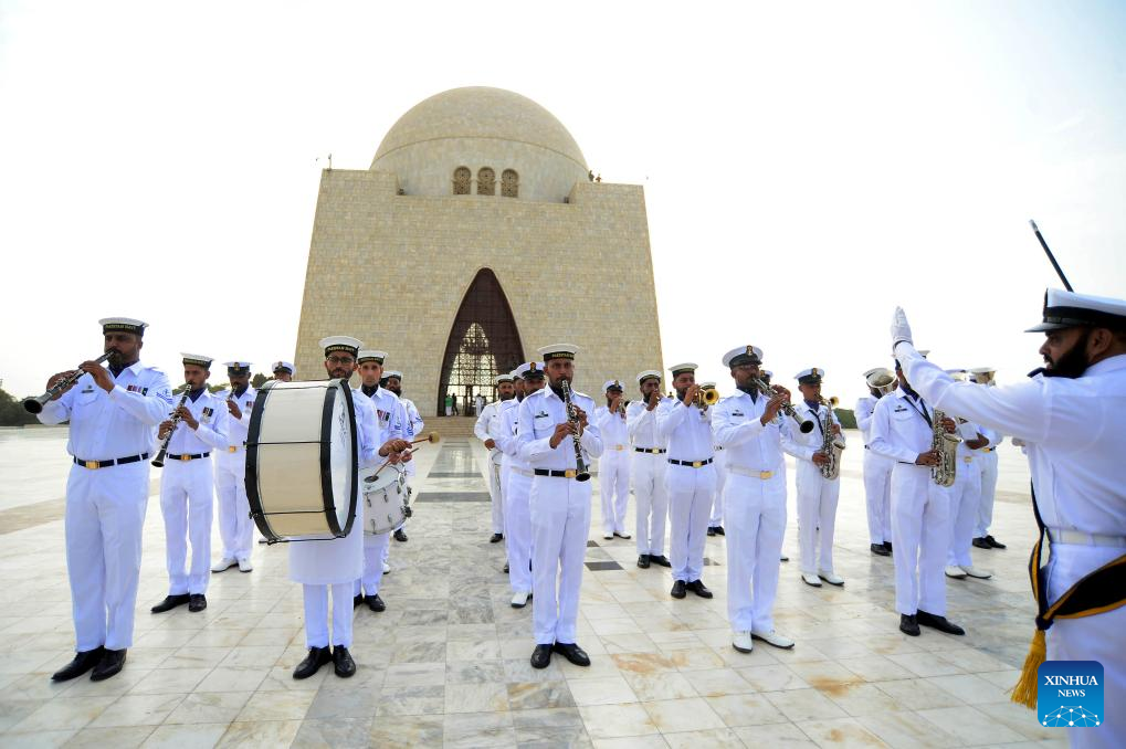 A Pakistani soldier band performs during a ceremony at the mausoleum of Pakistan's founder Muhammad Ali Jinnah to mark the country's Independence Day in southern Pakistani port city of Karachi on Aug. 14, 2025. (Str/Xinhua)