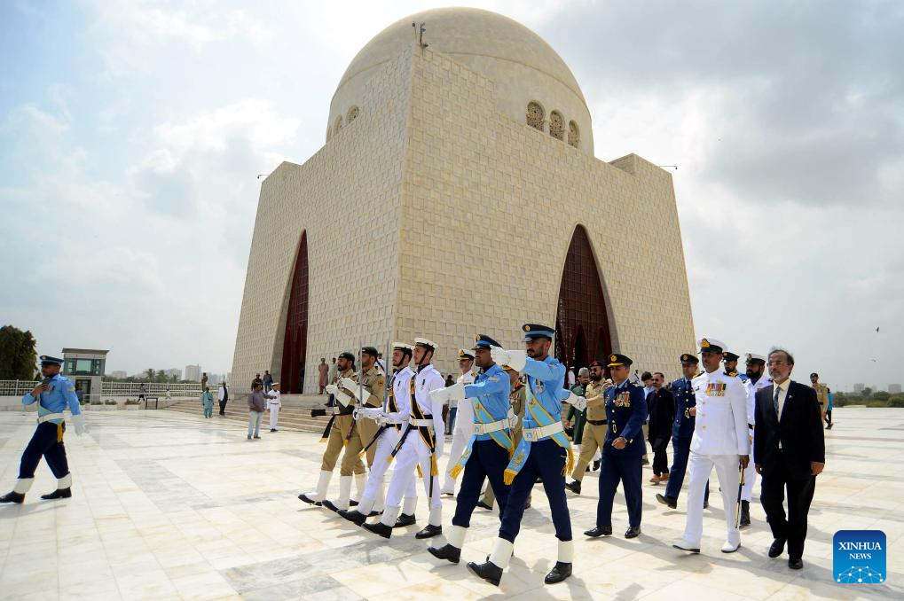 Pakistani soldiers attend a ceremony at the mausoleum of Pakistan's founder Muhammad Ali Jinnah to mark the country's Independence Day in southern Pakistani port city of Karachi on Aug. 14, 2025. (Str/Xinhua)