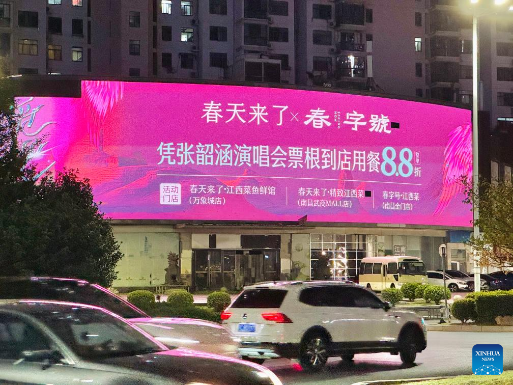 This photo shows an electronic screen displaying meal discount via concert ticket stubs in Nanchang, east China's Jiagxi Province, July 19, 2025. (Xinhua/Chen Zhuzuo)