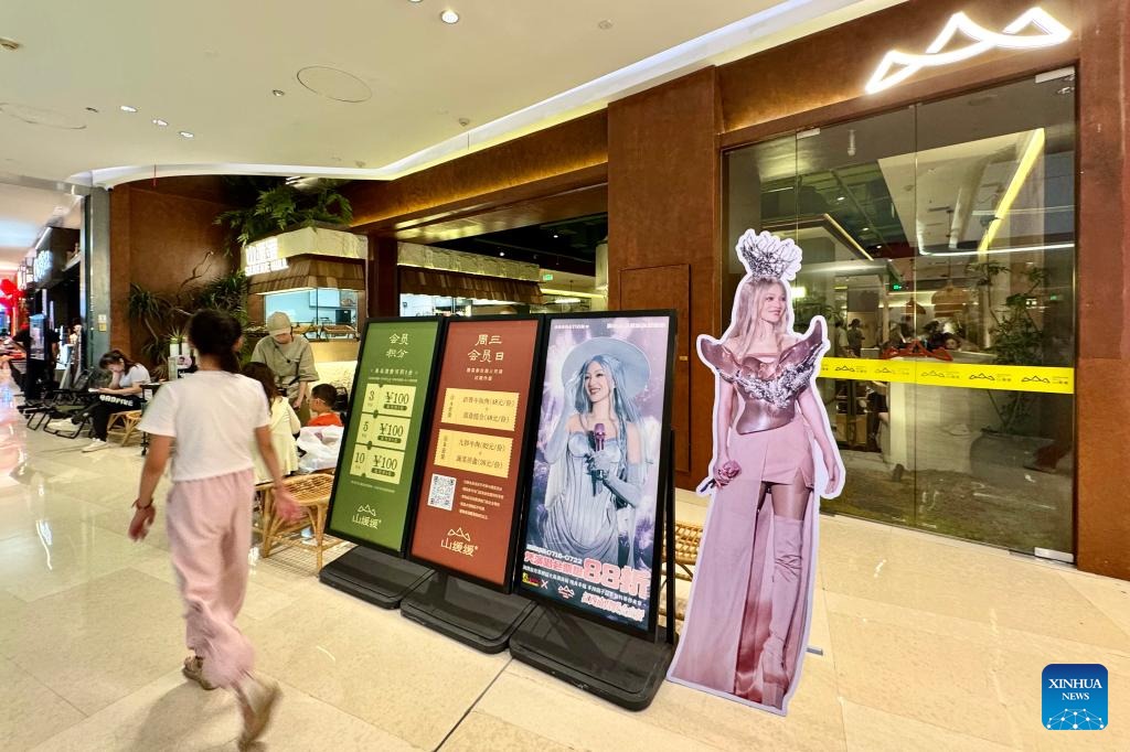 This photo shows placards displaying meal discount via concert ticket stubs in front of a restaurant in Nanchang, east China's Jiangxi Province, July 13, 2025.(Xinhua/Chen Zhuzuo)