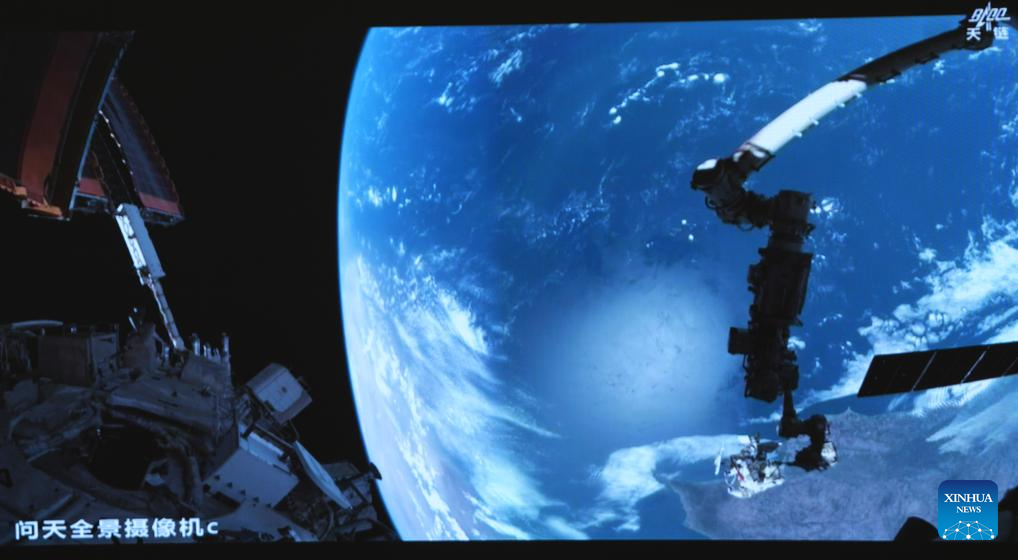 This screen image captured at Beijing Aerospace Control Center on Aug. 15, 2025 shows Shenzhou-20 astronaut Wang Jie leaving China's orbiting space station for extravehicular activities. The Shenzhou-20 crew aboard China's orbiting space station completed their mission's third series of extravehicular activities on Friday, according to the China Manned Space Agency (CMSA).(Xinhua/Li Yanchen)