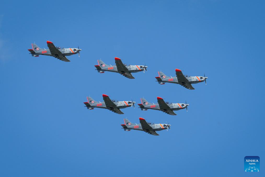 A formation of Polish Air Force trainer aircraft flies over during a military parade of Armed Forces Day in Warsaw, Poland, on Aug. 15, 2025. Poland celebrated its Armed Forces Day on Friday with a grand parade along the Vistula River in Warsaw, featuring more than 4,000 soldiers. (Photo by Jaap Arriens/Xinhua)