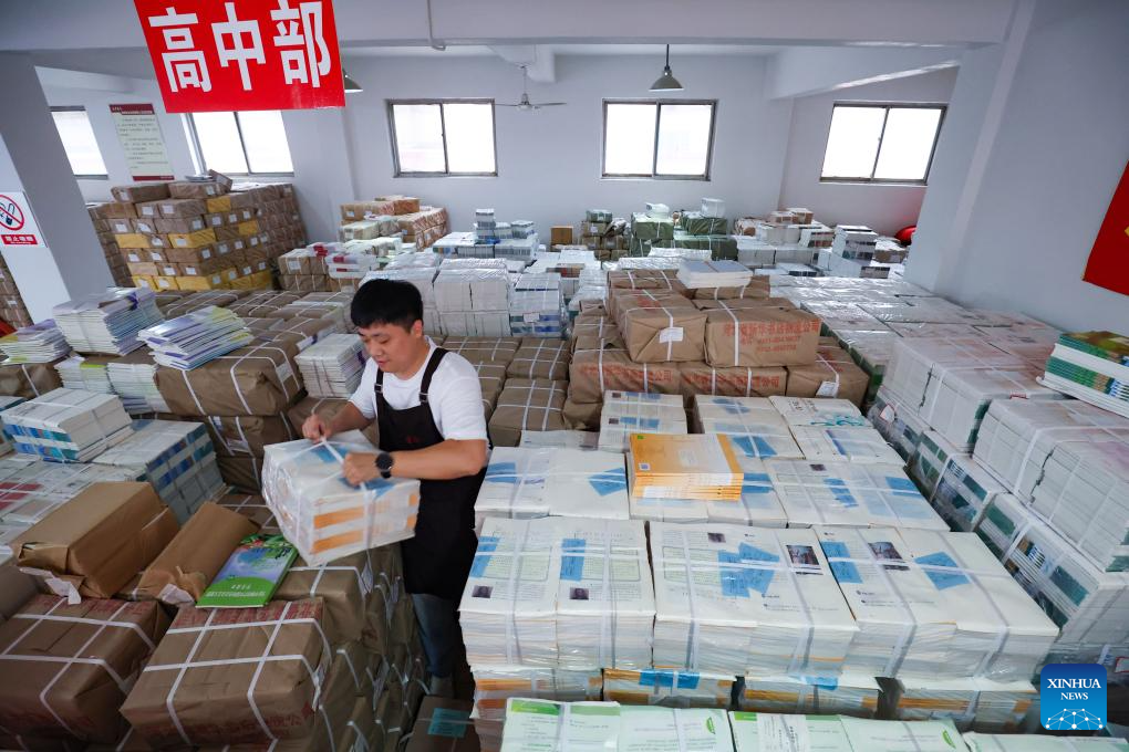 Staff members pack textbooks for the upcoming new semester at a publisher in Anshun City, southwest China's Guizhou Province, Aug. 16, 2025. Schools and bookstores across the country are getting textbooks ready for the upcoming new semester. (Photo by Chen Xi/Xinhua)