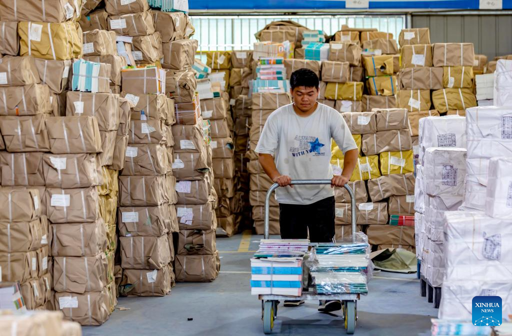 A staff member moves textbooks for the upcoming new semester at a warehouse in Linyi City, east China's Shandong Province, Aug. 16, 2025. Schools and bookstores across the country are getting textbooks ready for the upcoming new semester. (Photo by Wang Yanbing/Xinhua)
