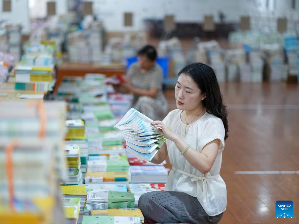 Faculty members sort out textbooks for the upcoming new semester at a school in Wuhan City, central China's Hubei Province, Aug. 16, 2025. Schools and bookstores across the country are getting textbooks ready for the upcoming new semester. (Photo by Zhao Jun/Xinhua)