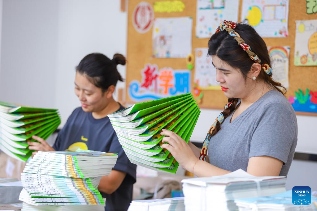 Faculty members sort out textbooks for the upcoming new semester at a school in Xinghua City, east China's Jiangsu Province, Aug. 16, 2025. Schools and bookstores across the country are getting textbooks ready for the upcoming new semester. (Photo by Zhou Shegen/Xinhua)