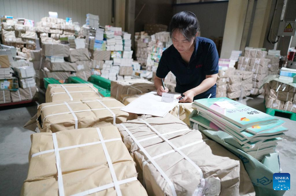 A staff member sorts out textbooks for the upcoming new semester at a warehouse in Shijiazhuang City, north China's Hebei Province, Aug. 16, 2025. Schools and bookstores across the country are getting textbooks ready for the upcoming new semester. (Photo by Zhang Xiaofeng/Xinhua)
