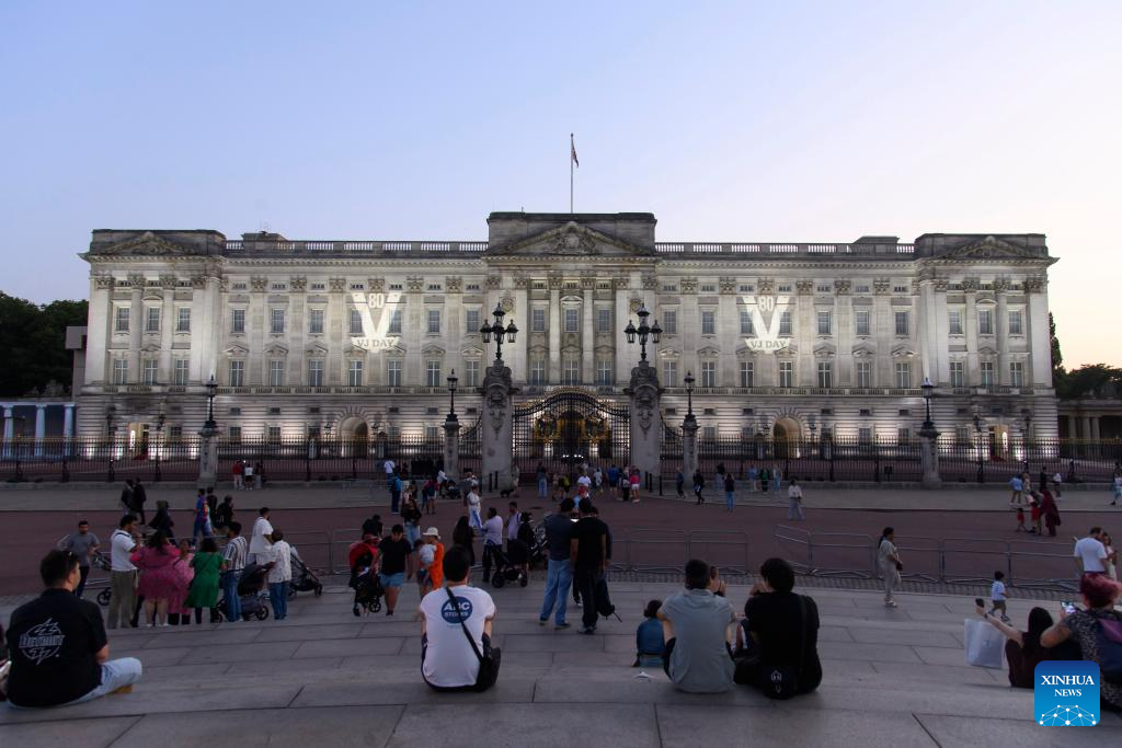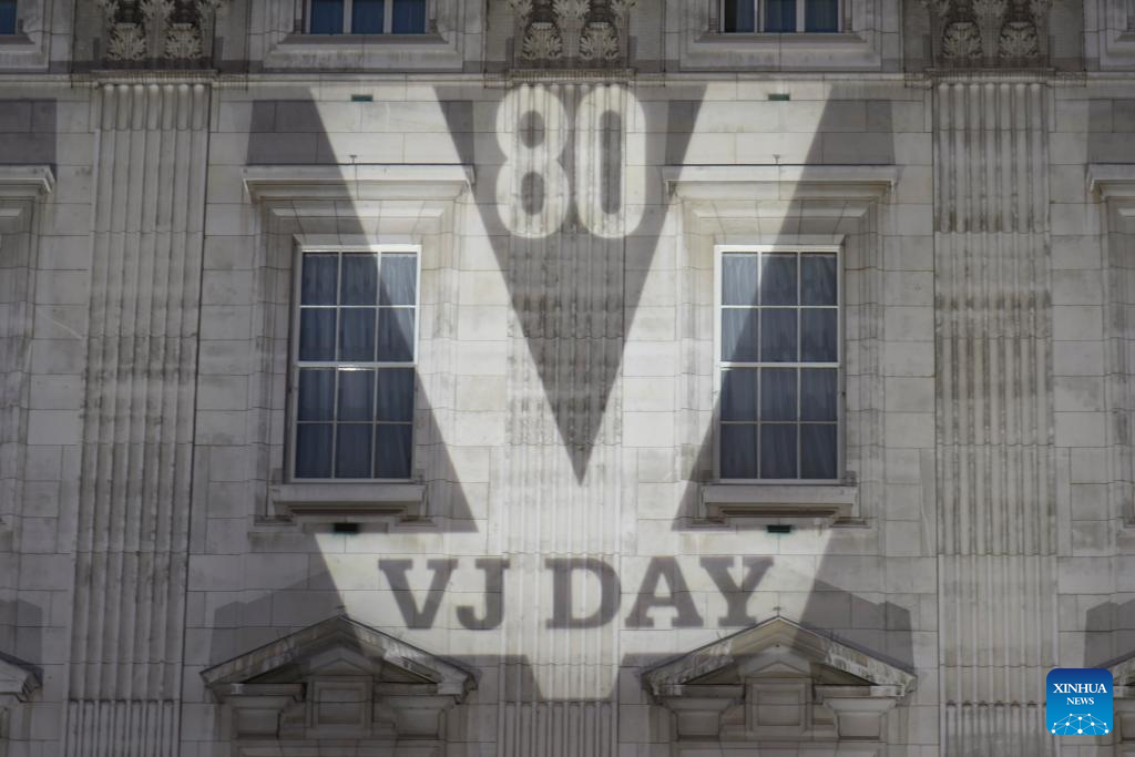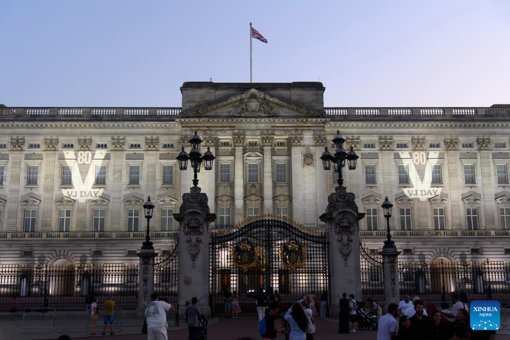Buckingham Palace is lit up to mark the 80th anniversary of Britain's Victory over Japan (VJ) Day, in London, Britain, on Aug. 15, 2025. As Friday marks the 80th anniversary of Britain's Victory over Japan (VJ) Day, the kingdom commemorated the occasion with a series of events. From 9 p.m. on Friday evening, hundreds of buildings and sites were illuminated to mark the day, including Buckingham Palace, 10 Downing Street, the Houses of Parliament, the Tower of London, and the White Cliffs of Dover. (Photo by Ray Tang/Xinhua)