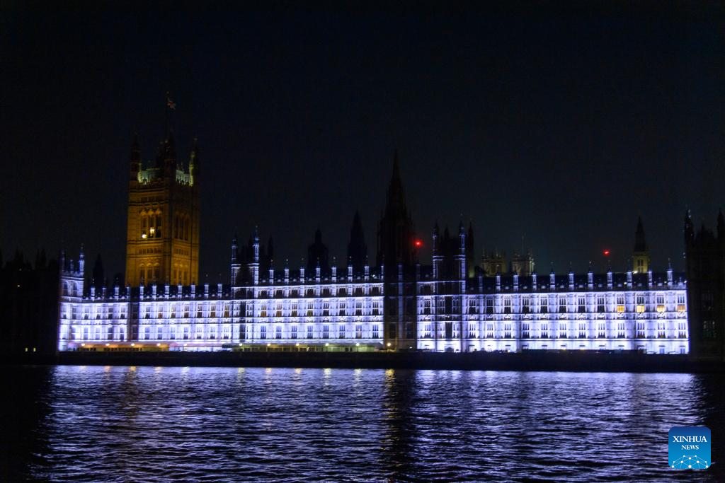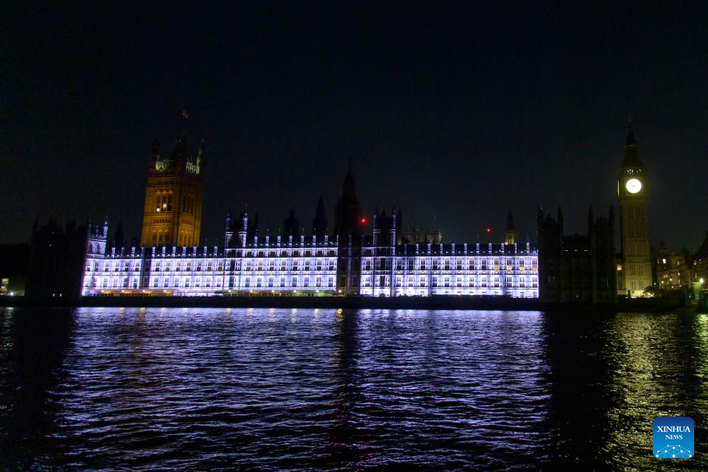 The Houses of Parliament are lit up to mark the 80th anniversary of Britain's Victory over Japan (VJ) Day, in London, Britain, on Aug. 15, 2025. As Friday marks the 80th anniversary of Britain's Victory over Japan (VJ) Day, the kingdom commemorated the occasion with a series of events. From 9 p.m. on Friday evening, hundreds of buildings and sites were illuminated to mark the day, including Buckingham Palace, 10 Downing Street, the Houses of Parliament, the Tower of London, and the White Cliffs of Dover. (Photo by Ray Tang/Xinhua)