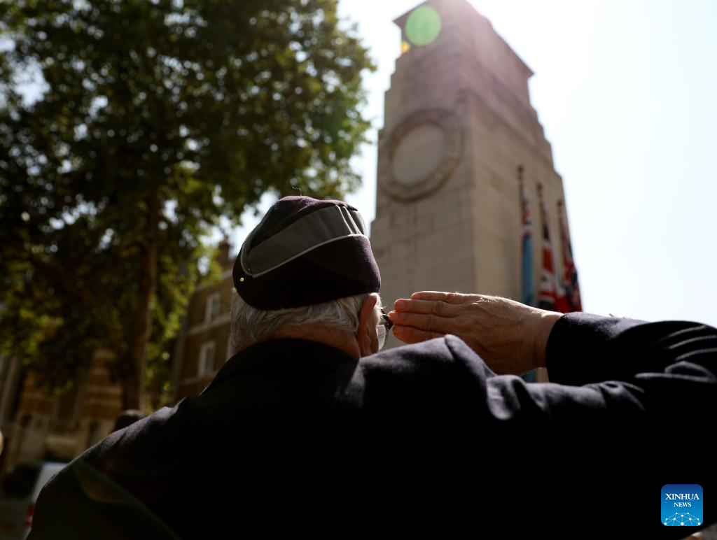 A veteran salutes in front of the Cenotaph during a national two-minute silence in London, Britain, Aug. 15, 2025. (Xinhua/Li Ying)