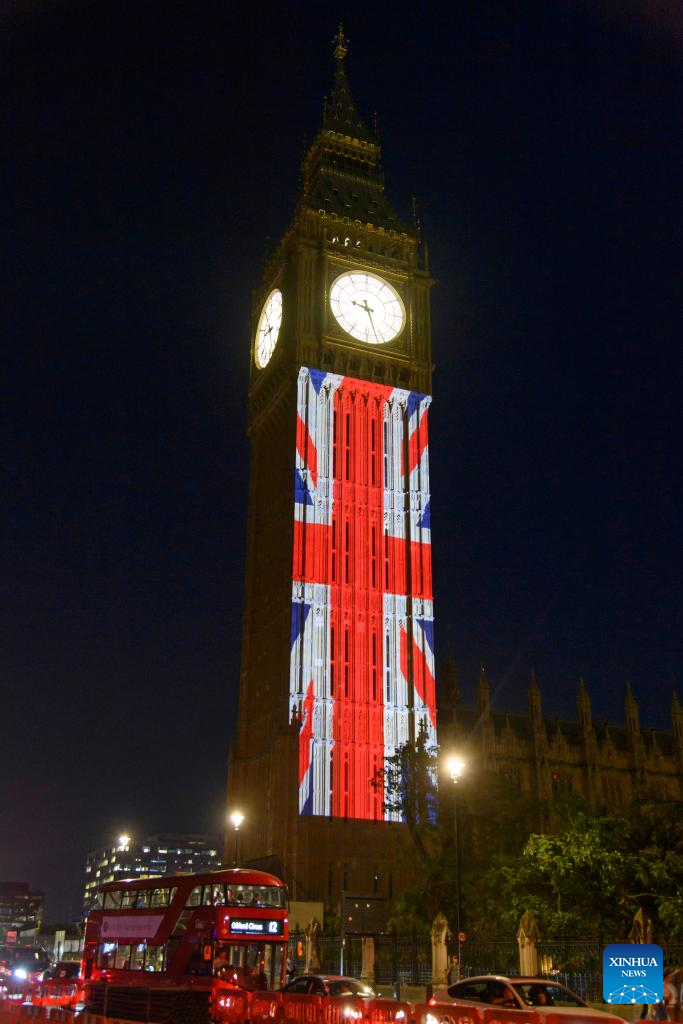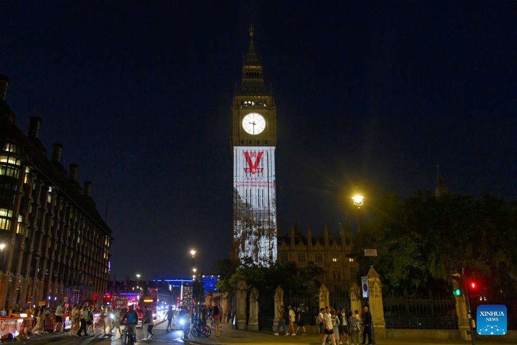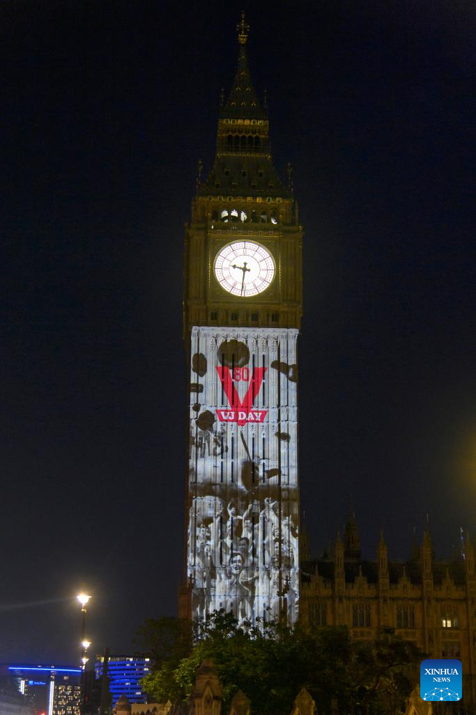 The Big Ben is lit up to mark the 80th anniversary of Britain's Victory over Japan (VJ) Day, in London, Britain, on Aug. 15, 2025. As Friday marks the 80th anniversary of Britain's Victory over Japan (VJ) Day, the kingdom commemorated the occasion with a series of events. From 9 p.m. on Friday evening, hundreds of buildings and sites were illuminated to mark the day, including Buckingham Palace, 10 Downing Street, the Houses of Parliament, the Tower of London, and the White Cliffs of Dover. (Photo by Ray Tang/Xinhua)