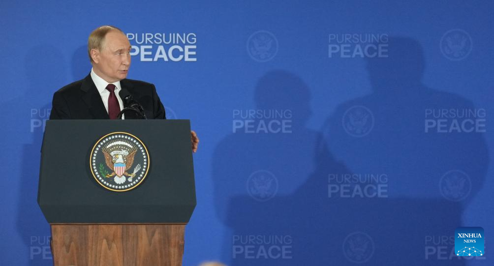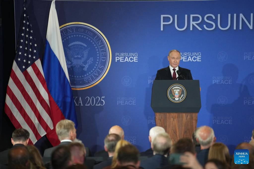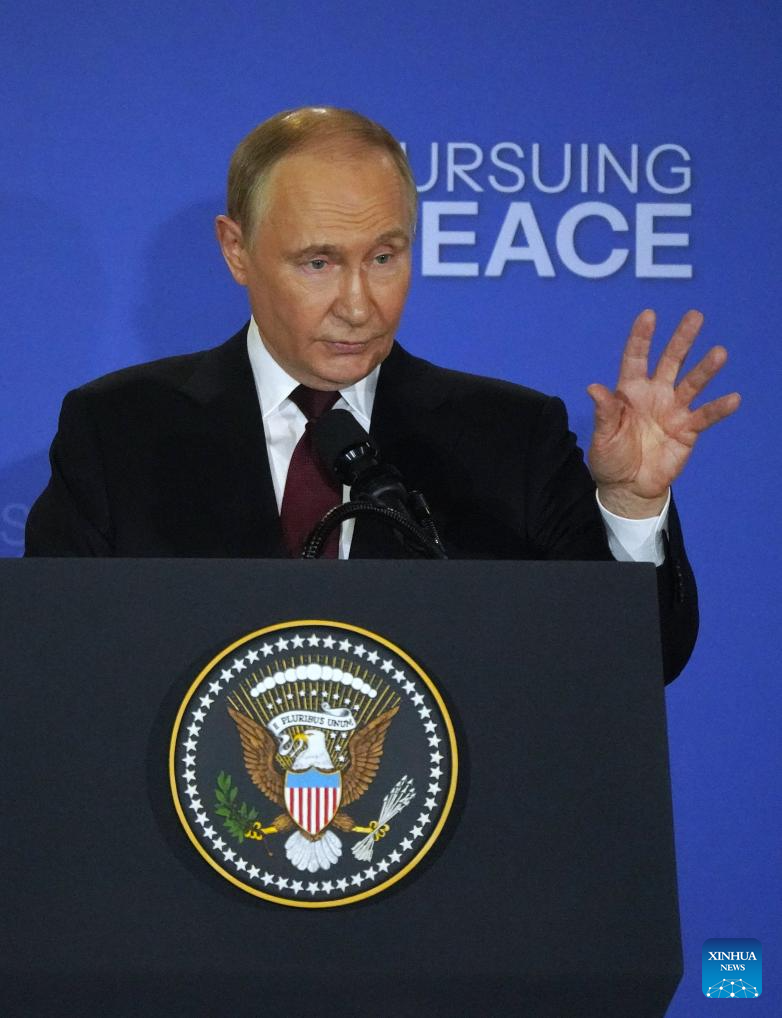 Russian President Vladimir Putin addresses a joint press conference with U.S. President Donald Trump (not in the picture) after concluding their talks in Anchorage, Alaska, the United States, on Aug. 15, 2025.The talks, held at Joint Base Elmendorf-Richardson in the city of Anchorage, lasted about three hours. (Xinhua/Wu Xiaoling)