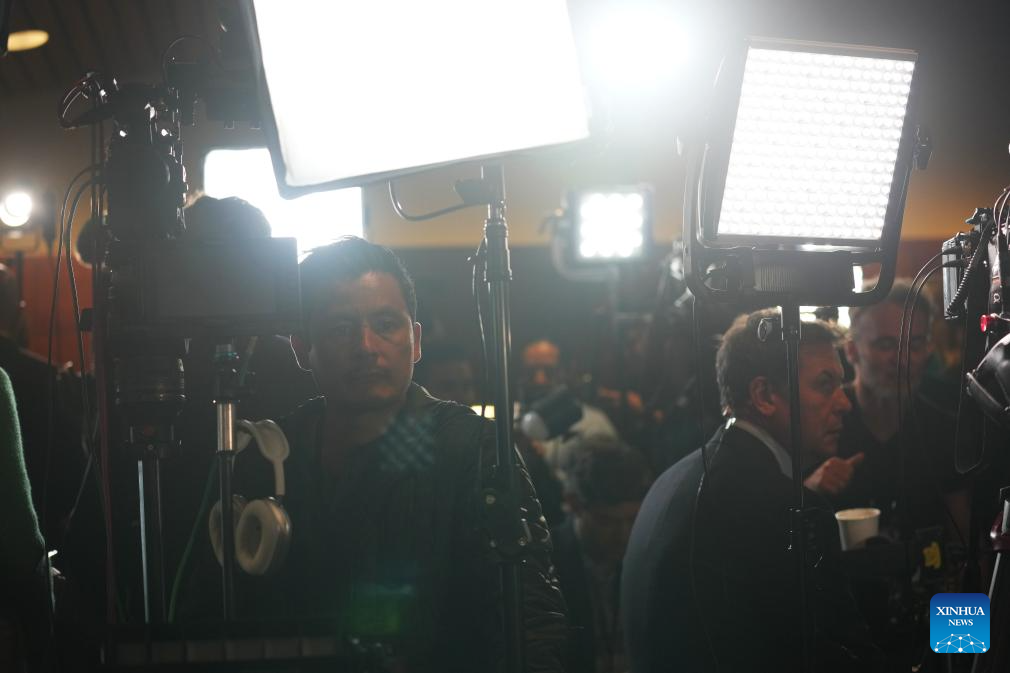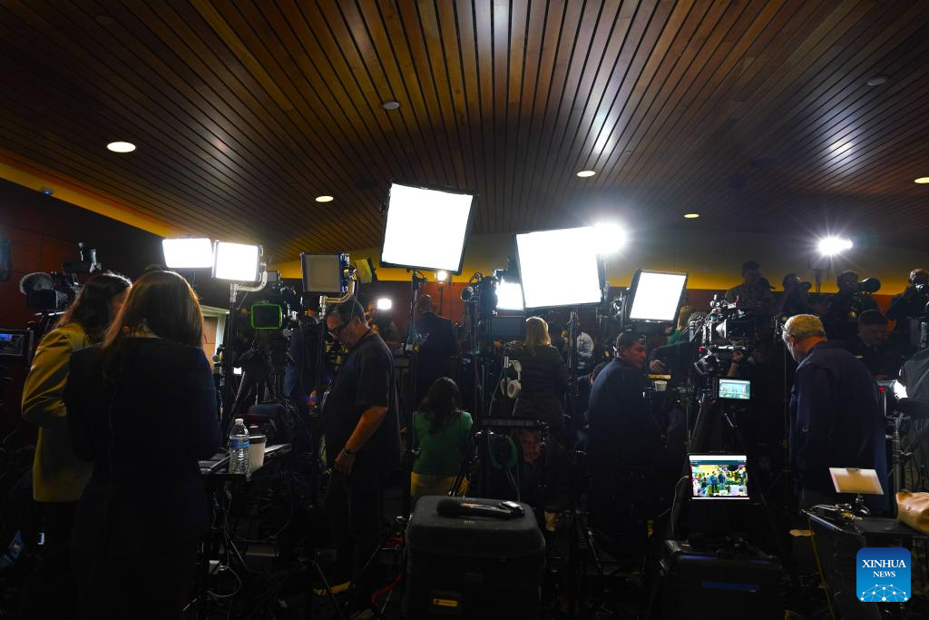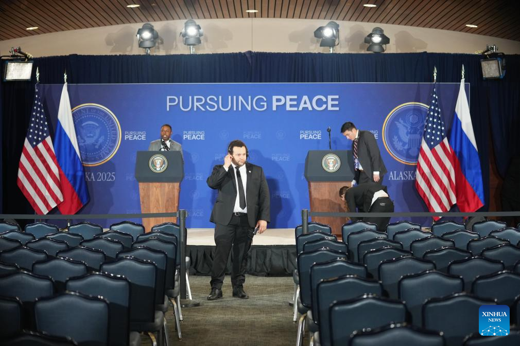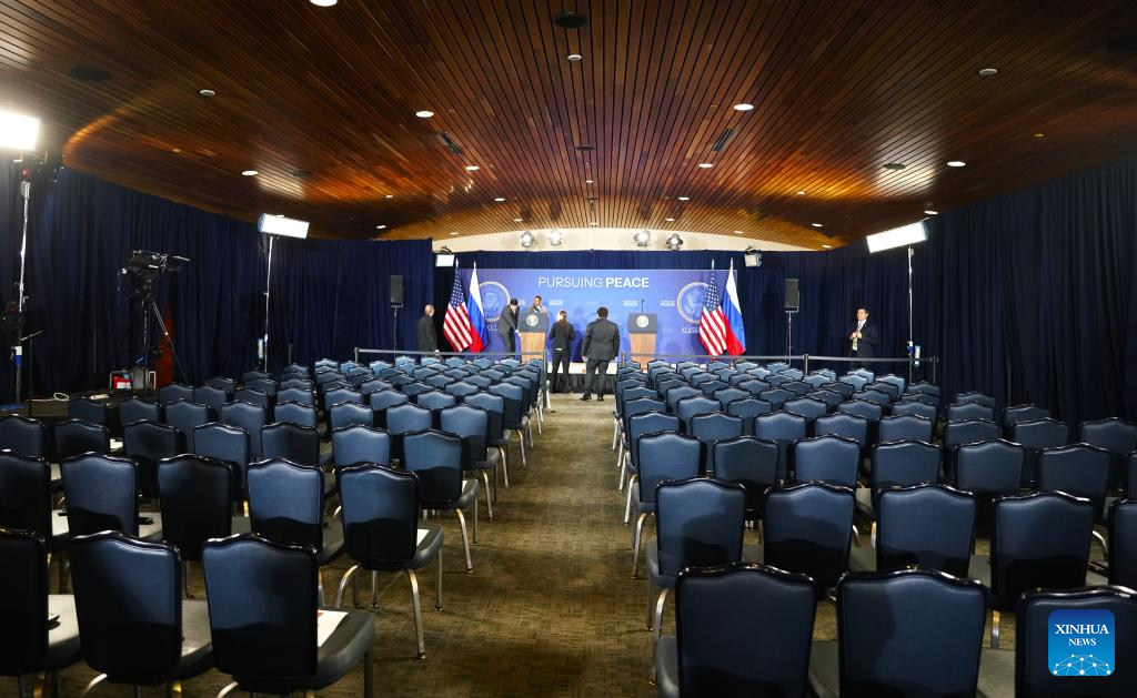Photo taken on Aug. 15, 2025 shows a press room ahead of a meeting between Russian President Vladimir Putin and U.S. President Donald Trump at Joint Base Elmendorf-Richardson in Anchorage, Alaska, the United States. (Xinhua/Wu Xiaoling)