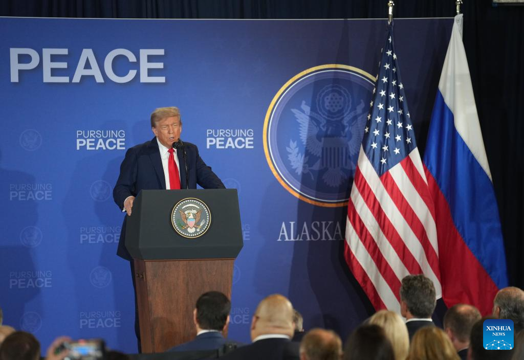 U.S. President Donald Trump addreses a joint press conference with Russian President Vladimir Putin (not in the picture) after concluding their talks in Anchorage, Alaska, the United States, on Aug. 15, 2025.The talks, held at Joint Base Elmendorf-Richardson in the city of Anchorage, lasted about three hours. (Xinhua/Wu Xiaoling)